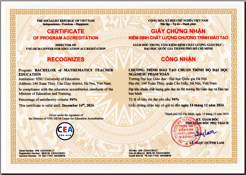 - Chứng nhận Kiểm định chất lượng chương trình đào tạo trình độ thạc sĩ ngành Lý luận và Phương pháp dạy học bộ môn Toán