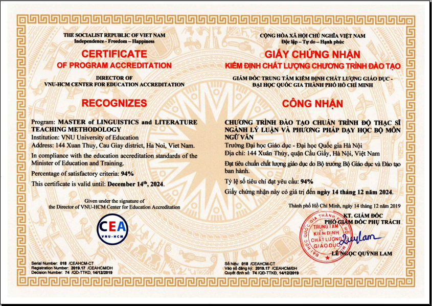 - Chứng nhận Kiểm định chất lượng chương trình đào tạo chuẩn trình độ đại học ngành Sư phạm Ngữ Văn