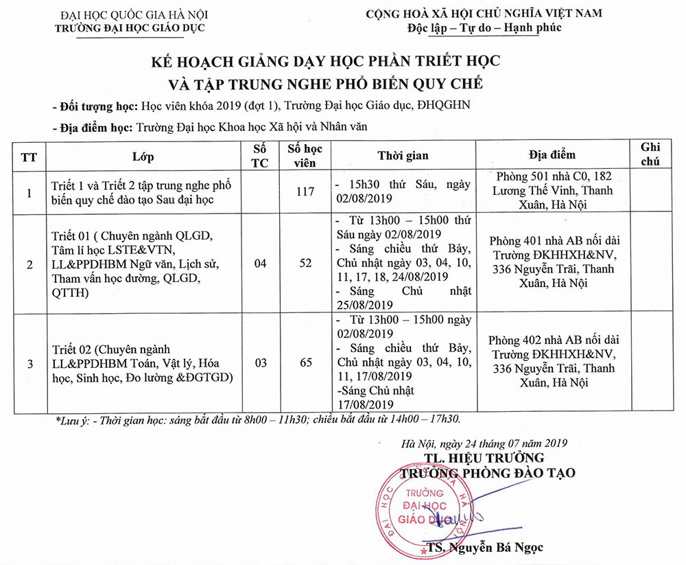 Trường Đại học Giáo dục, Đại học Quốc gia Hà Nội thông báo về kế hoạch học môn Triết học và lịch tập trung phổ biến quy chế đào tạo Sau đại học đợt 1 năm 2019. Chi tiết như sau:
