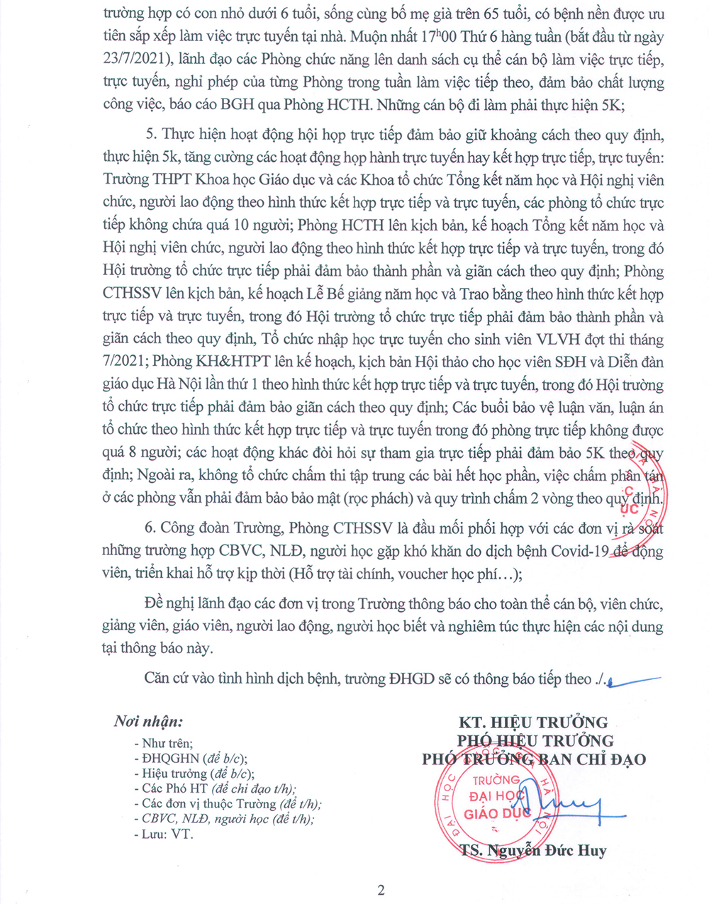 Trước tình hình diễn biến phức tạp của dịch bệnh Covid-19, thực hiện Công điện số 15/CĐ-UBND ngày 18/7/2021 của Chủ tịch Uỷ ban Nhân dân Thành phố Hà Nội về việc triển khai các biện pháp cấp bách phòng, chống dịch Covid-19 trên địa bàn thành phố, Công văn số 2150/ĐHQGHN-CT&CTHSSV ngày 21/7/2021 của Giám đốc ĐHQGHN về việc tăng cường công tác chăm sóc, hỗ trợ sinh viên gặp khó khăn do dịch bệnh Covid-19, Trường Đại học Giáo dục đề nghị các đơn vị, cán bộ, viên chức, giảng viên, giáo viên, người lao động và người học thực hiện các nội dung dưới đây. Chi tiết nội dung công văn như sau: