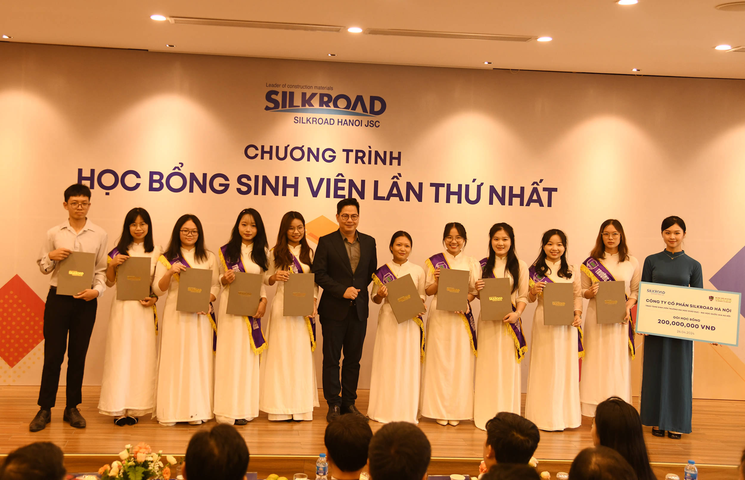 Theo đó, công ty trao 50 suất học bổng tới các em sinh viên. Trong đó có 10 sinh viên trường Đại học Giáo dục – ĐHQGHN, 15 sinh viên trường Đại học Xây dựng, 25 sinh viên là con em cán bộ công nhân viên đang công tác tại công tác với Công ty CP Silkroad Hà Nội.