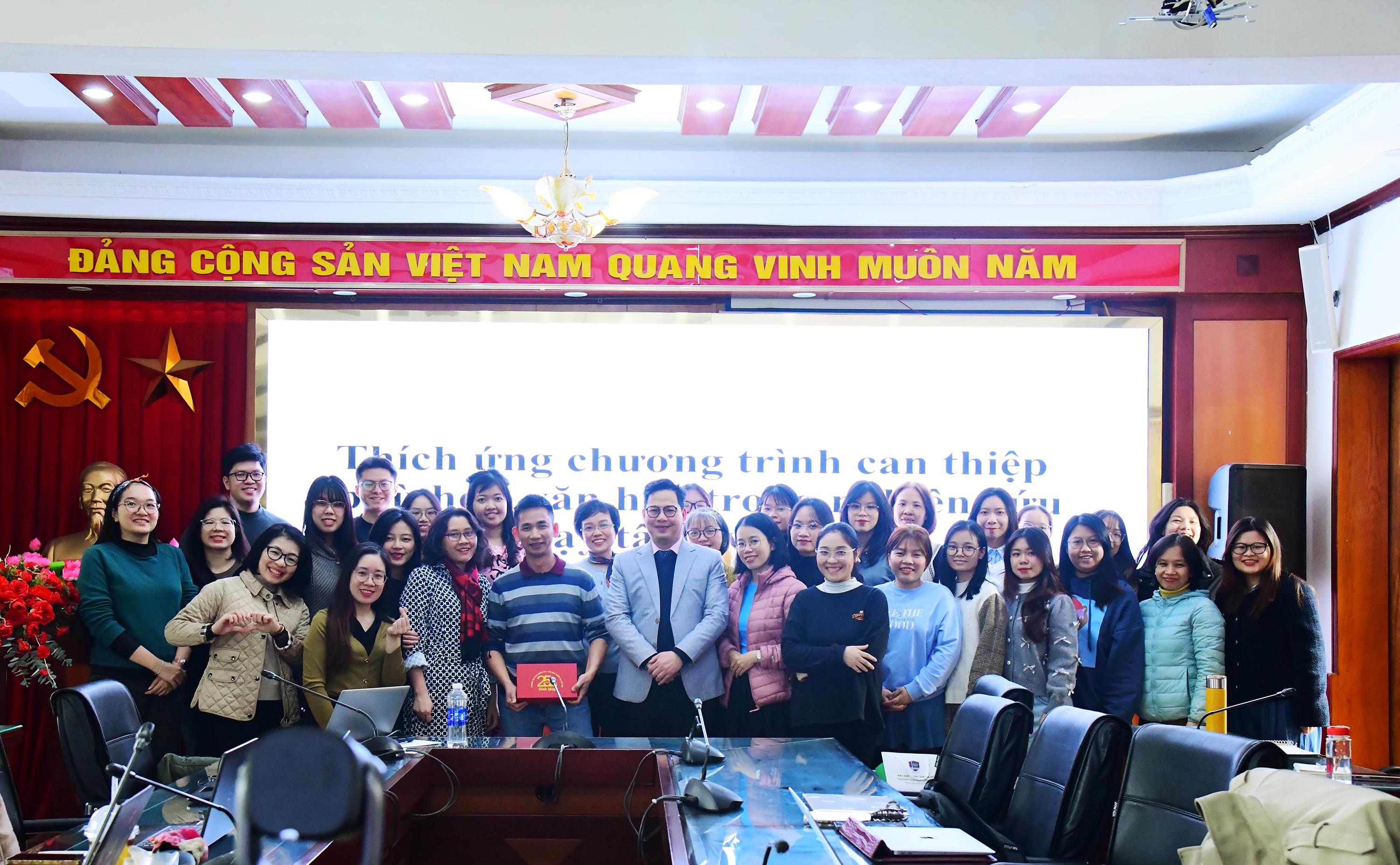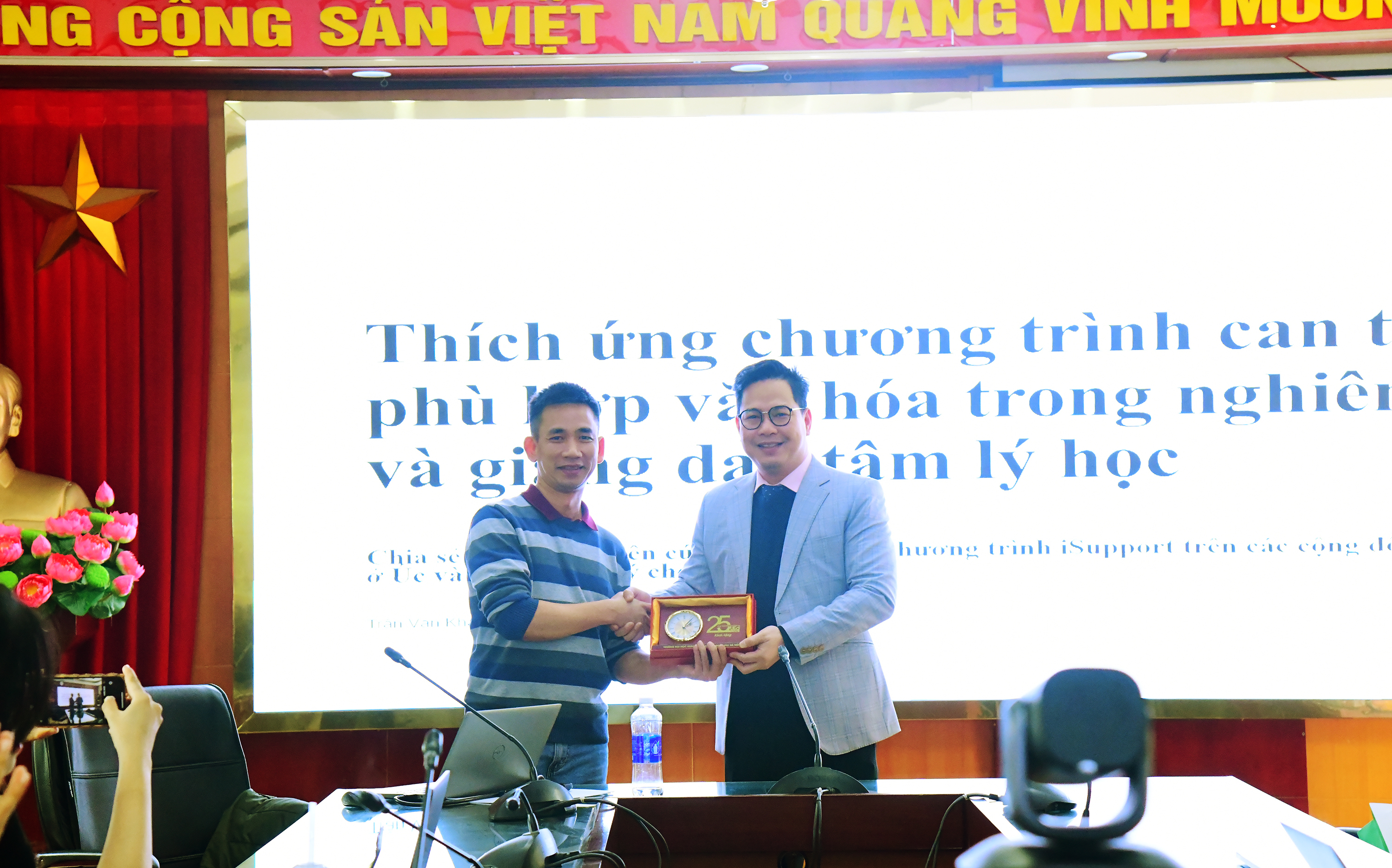Bên cạnh đó, TS. Trần Văn Kham đã chia sẻ về quá trình thích ứng mô hình can thiệp tâm lý bao gồm rà soát tài liệu, tham gia đối tượng nghiên cứu, đánh giá nhu cầu, điều chỉnh nội dung can thiệp và xử lý vấn đề đạo đức, nhằm đảm bảo tính phù hợp với bối cảnh văn hóa và cộng đồng tại Việt Nam.