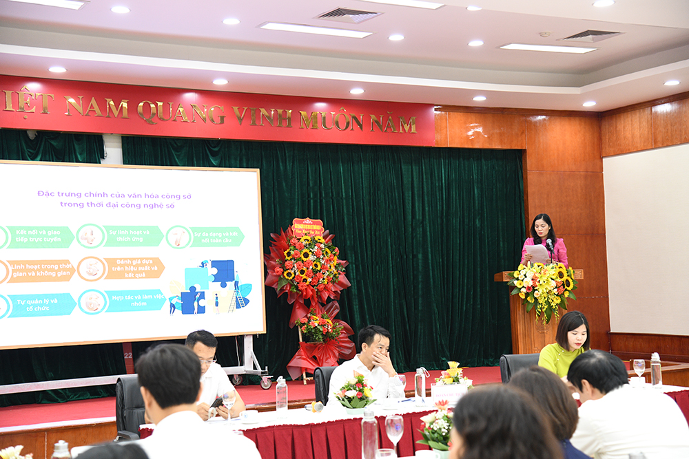 Đồng chí công đoàn viên Chu Thị Hồng Nhung trình bày báo cáo tham luận: “Phát triển Văn hoá công sở trong bối cảnh phát triển công nghệ hiện nay”.