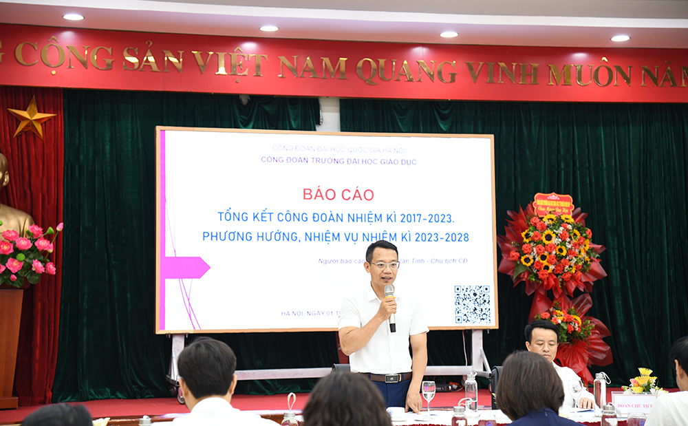 Tại Đại hội, các đại biểu đã được nghe Chủ tịch Công đoàn Trường đồng chí Trần Văn Tính trình bày báo cáo tổng kết Công đoàn nhiệm kỳ 2017-2023 và phương hướng hoạt động công tác Công đoàn Trường Đại học Giáo dục nhiệm kỳ 2023 -2028.