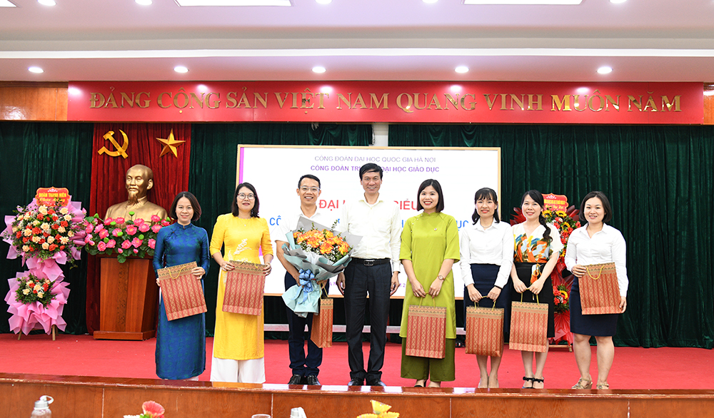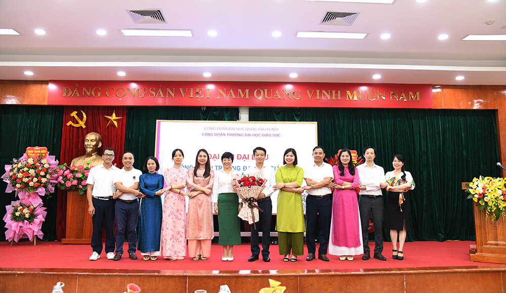 Phó Chủ tịch phụ trách Công đoàn ĐHQGHN Nguyễn Thị Thảo thay mặt Công đoàn ĐHQGHN tặng hoa chúc mừng Ban chấp hành Công đoàn Trường Đại học Giáo dục nhiệm kỳ 2023-2028 ra mắt đại hội