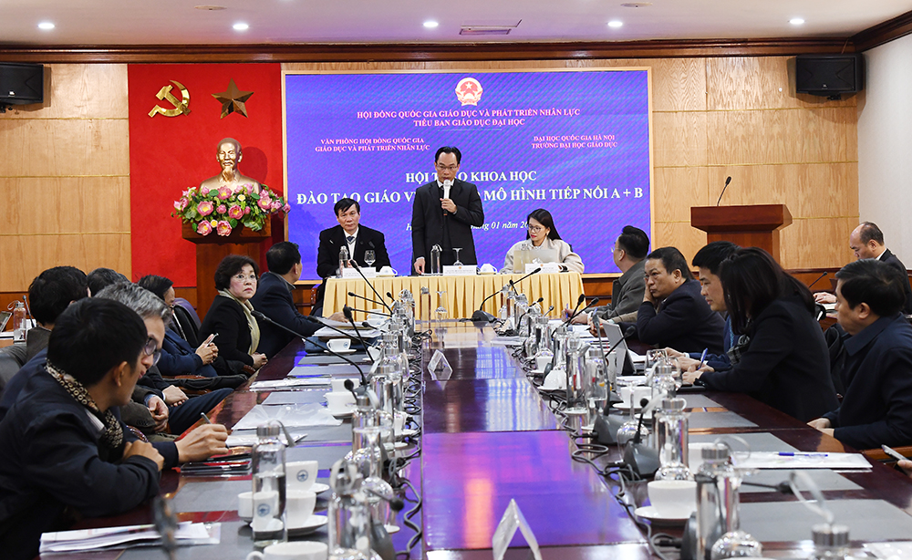 “ĐH Quốc gia Hà Nội tin tưởng vào những triết lý đào tạo và mô hình của mình. Với ưu thế của đại học đa ngành, chúng tôi đã thí điểm mô hình đào tạo giáo viên (a+b) - PGS.TS Nguyễn Kim Sơn cho biết, đồng thời nhấn mạnh: Đây là mô hình tiêu biểu cần có nghiên cứu đánh giá tổng kết và nhân rộng những ưu thế của mình hình này.