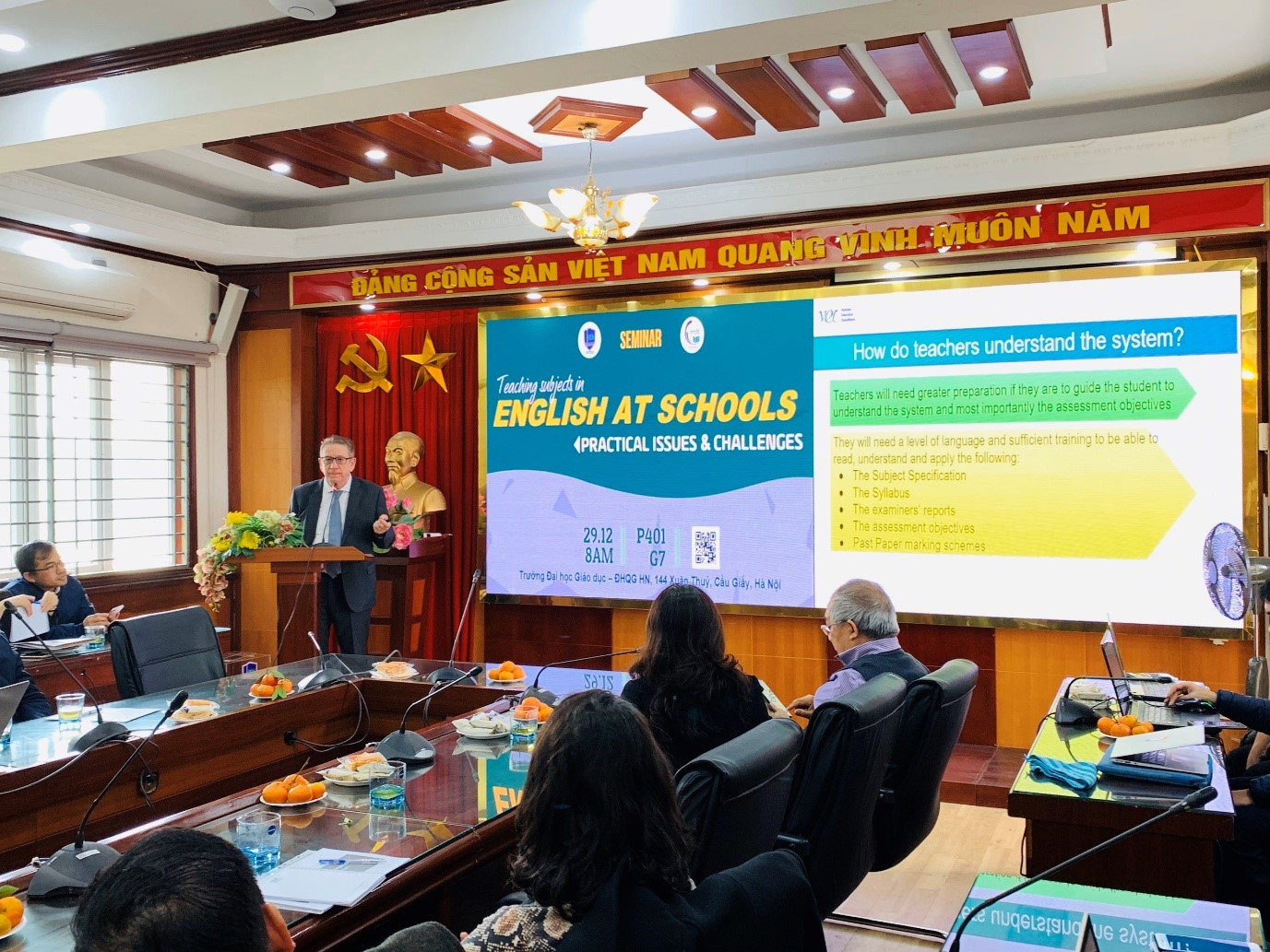 Các báo cáo viên được mời tham dự là ThS. Horace Vernall – Nguyên tổng hiệu trưởng trường TH school, tổng hiệu trưởng hệ thống giáo dục liên cấp Ban Mai, ThS. Abi Vernall – Giám đốc điều hành VEC (Vietnam education consultant) và TS. Vũ Thị Thanh Nhã – Trưởng khoa Tiếng Anh trường Đại Học Ngoại ngữ - Đại học Quốc gia Hà Nội. GS. TSKH. Trần Văn Nhung, nguyên Thứ trưởng Bộ Giáo dục và Đào tạo đã đến tham dự và chia sẻ cùng với đông đảo các sinh viên, học viên, các giáo viên và nhà nghiên cứu tham gia seminar.