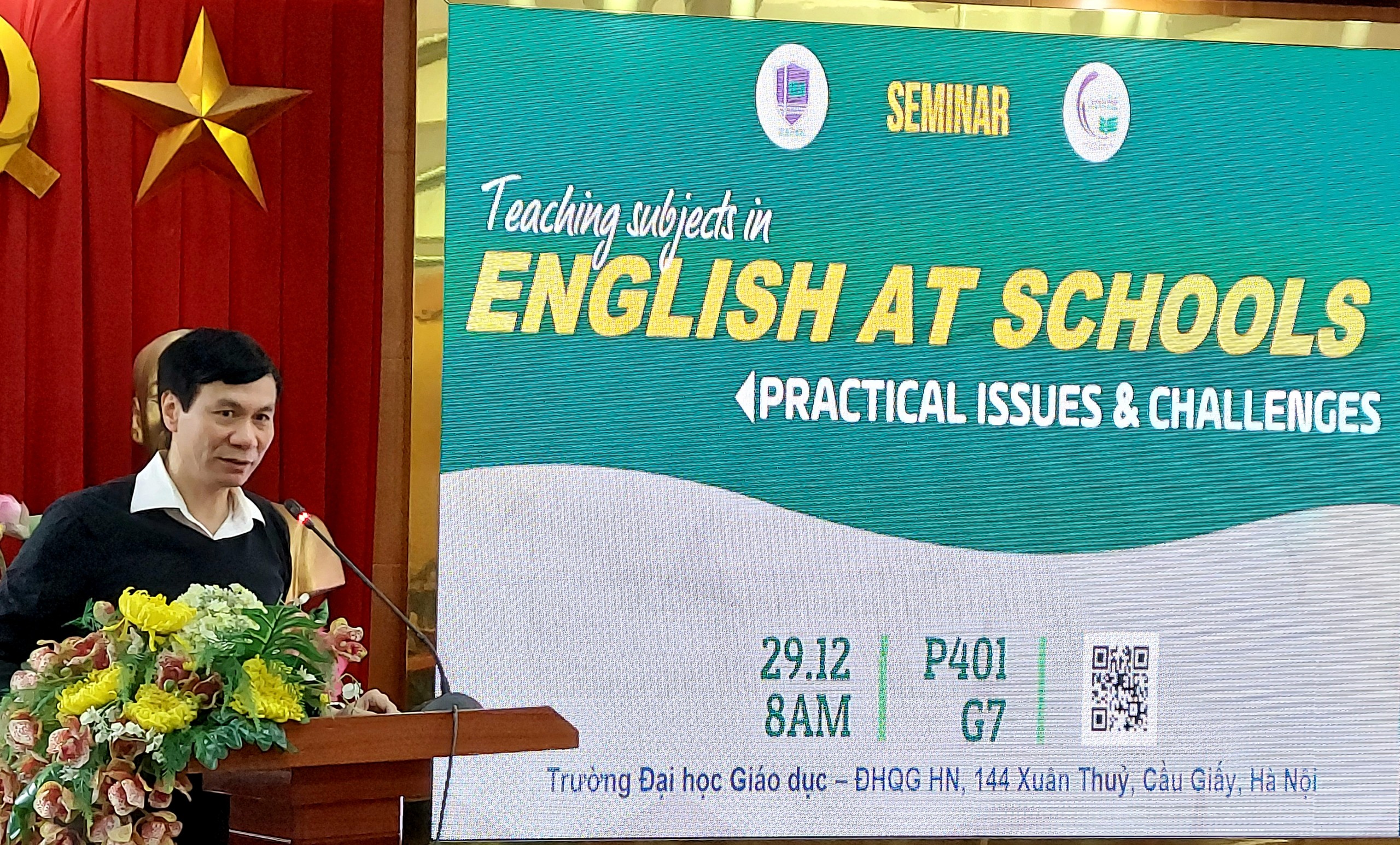 Phát biểu khai mạc seminar, GS. TS. Nguyễn Quý Thanh, Hiệu trưởng trường ĐHGD đã nhấn mạnh vai trò của tiếng Anh trong bối cảnh toàn cầu hóa cũng như các lợi ích của tiếng Anh trong nghiên cứu, tìm học liệu cũng như tìm hiểu một những nền văn hóa khác ‘’tiếng Anh như một cửa sổ dẫn ta đến những chân trời mới’’. Trường ĐHGD đã xây dựng nhiều học phần trong chương trình đào tạo để giảng dạy trực tiếp bằng tiếng Anh cũng như đã mở nhiều khóa bồi dưỡng nâng cao năng lực dạy học Toán và Khoa học bằng tiếng Anh cho giáo viên phổ thông.