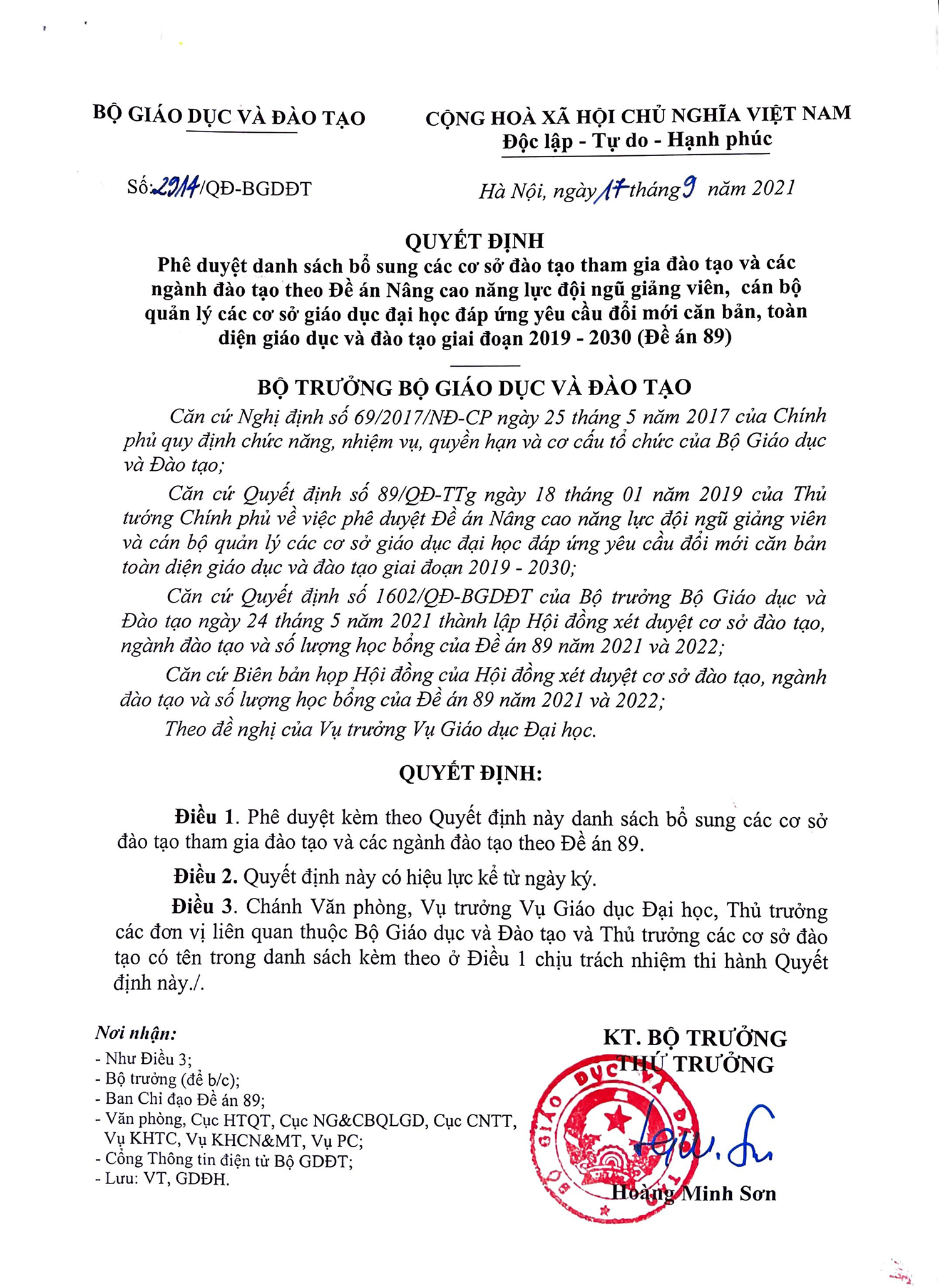 Ngày 18/1/2019, Thủ tướng Chính phủ đã có quyết định 89 phê duyệt Đề án "Nâng cao năng lực đội ngũ giảng viên, cán bộ quản lý các cơ sở giáo dục đại học đáp ứng yêu cầu đổi mới căn bản toàn diện giáo dục và đào tạo giai đoạn 2019-2030" (Đề án 89).