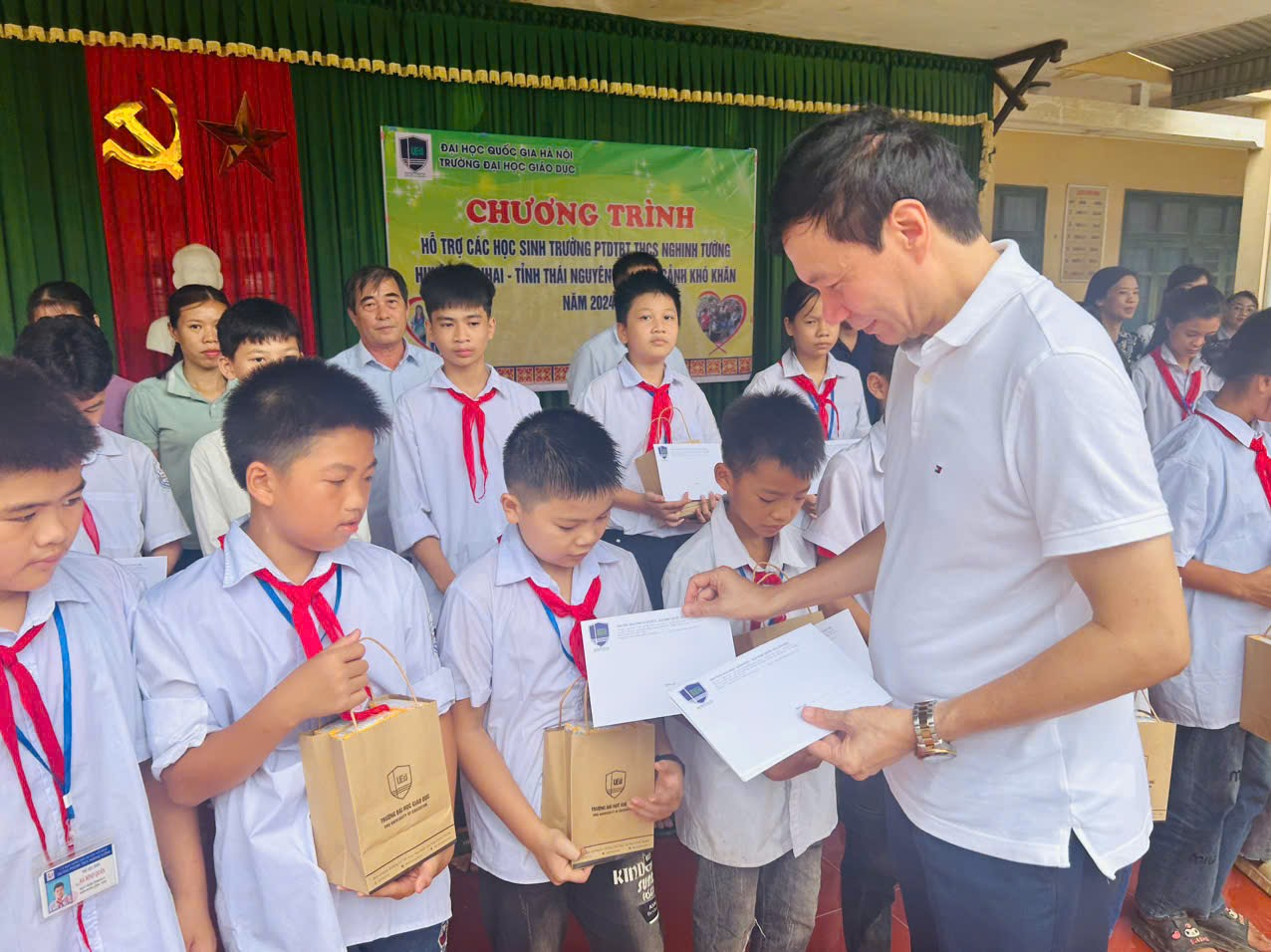 Hiệu trưởng Trường Đại học Giáo dục GS.TS. Nguyễn Quý Thanh đại diện Nhà trường tặng quà cho các em học sinh trường PTDTBT THCS Nghinh Tường