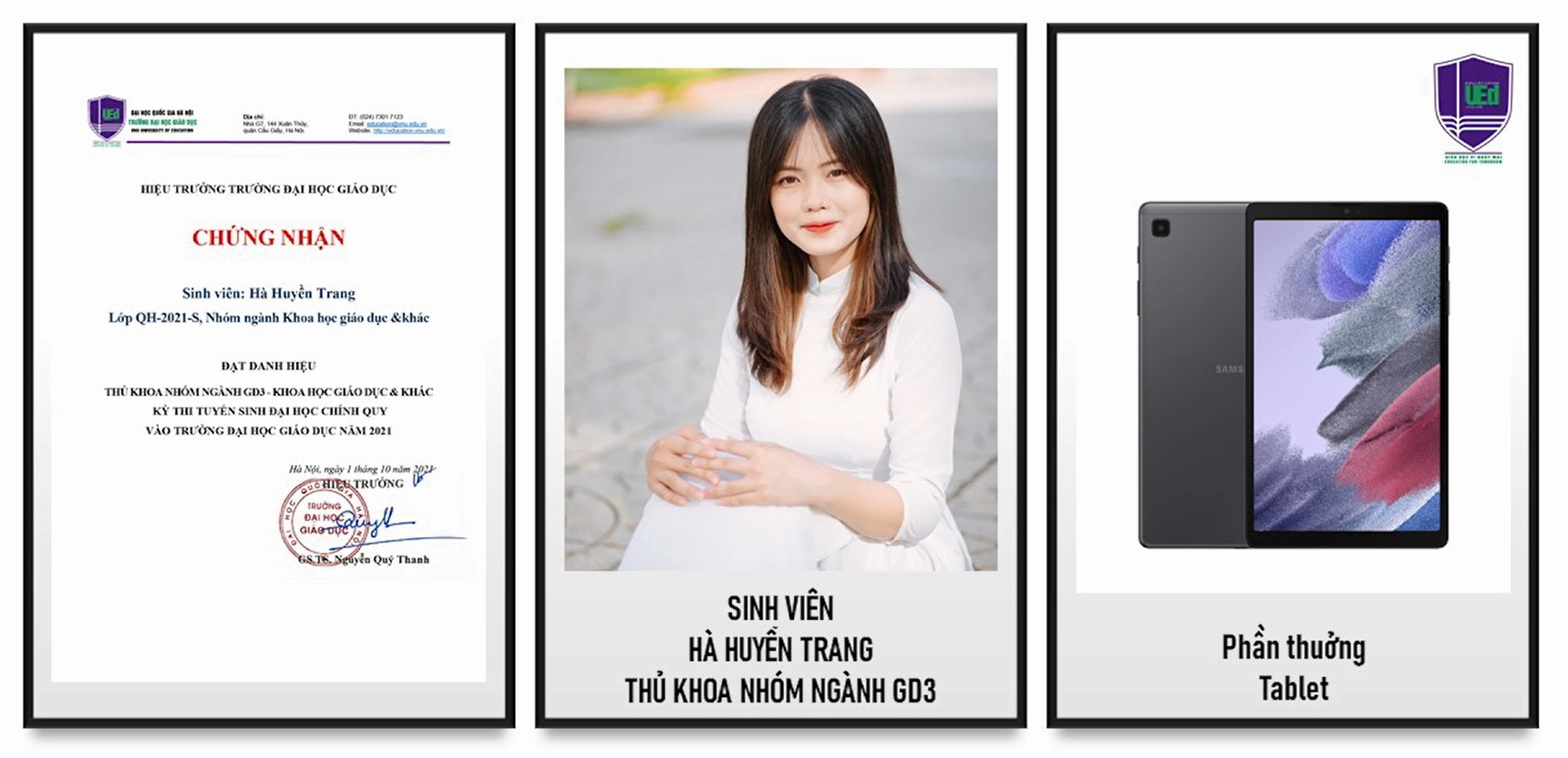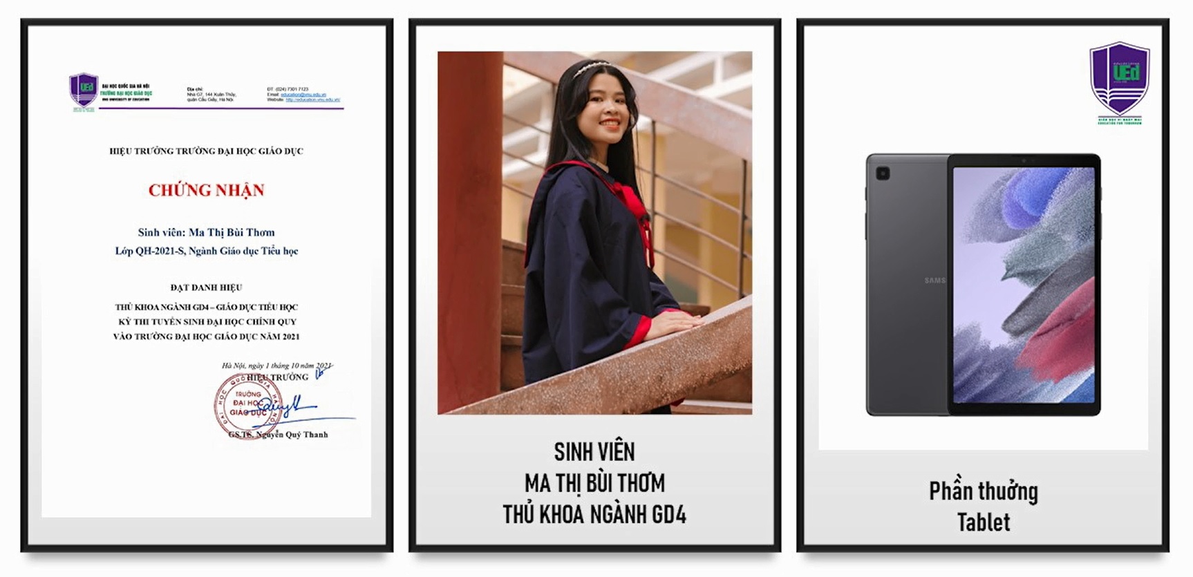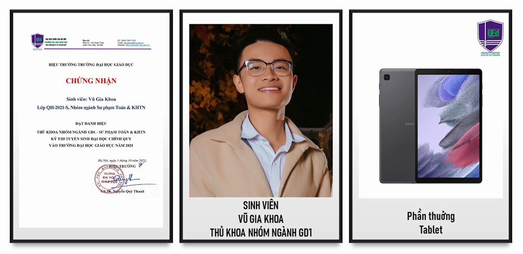Tại Lễ Khai giảng Trường Đại học Giáo dục đã trao thưởng và vinh danh các tân sinh viên: 01 là Thủ khoa, 02 Á khoa của Trường và phần thưởng 01 máy tính xách tay/1 sinh viên; 05 Thủ khoa các nhóm ngành với phần thưởng là 01 máy tính bảng/1 sinh viên. Ngoài ra, 5 Tân sinh viên có hoàn cảnh khó khăn đạt kết quả cao trong Kỳ thi tuyển sinh THPT Nhà trường hỗ trợ 1 máy tính bảng và 5 triệu đồng tiền mặt. Kinh phí được trích từ nguồn ủng hộ và đóng góp của cán bộ, giảng viên và các tổ chức, cá nhân là đối tác của Trường.