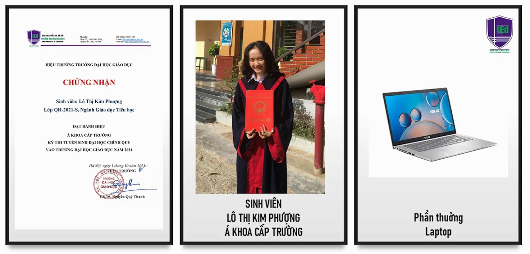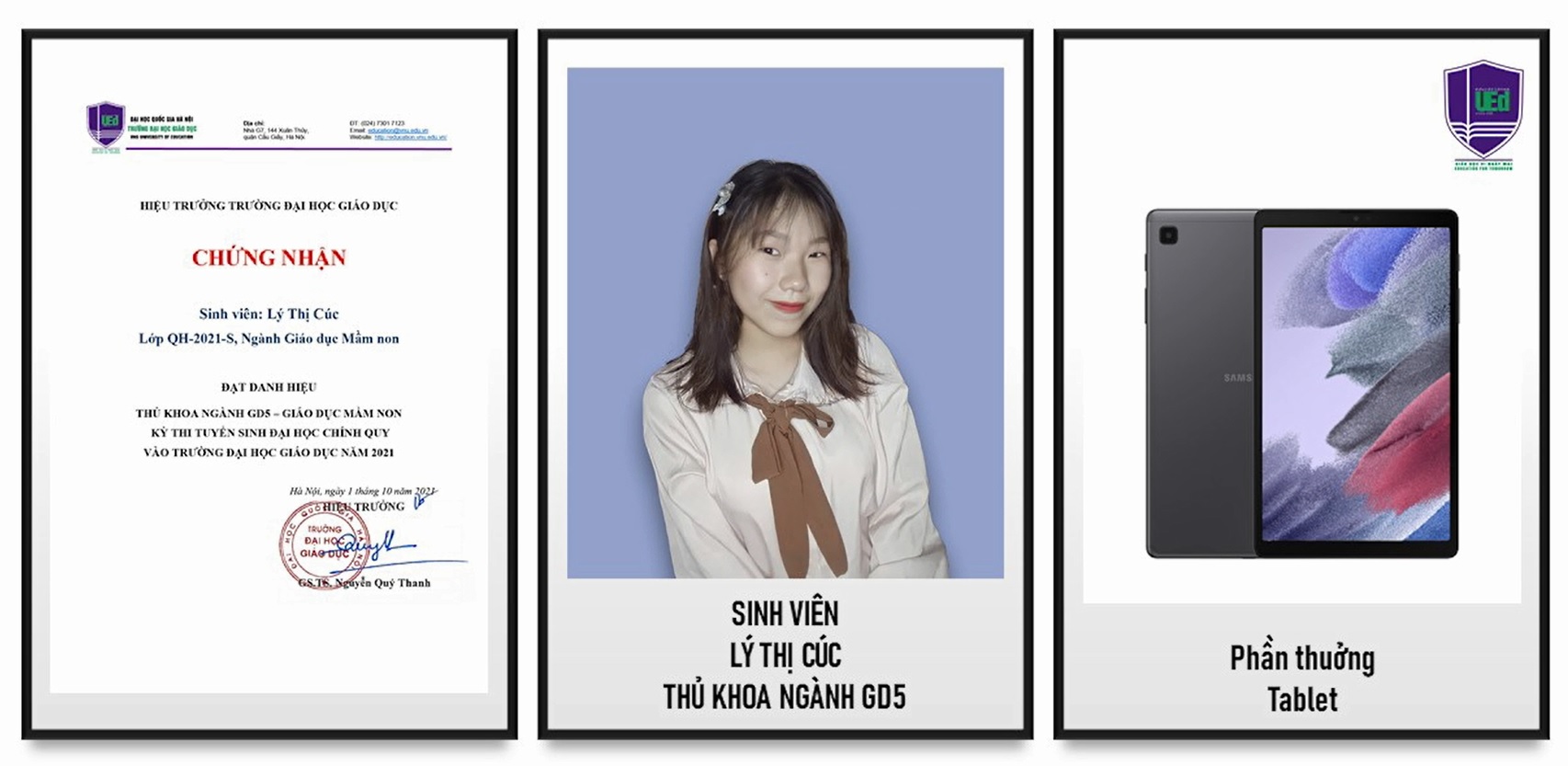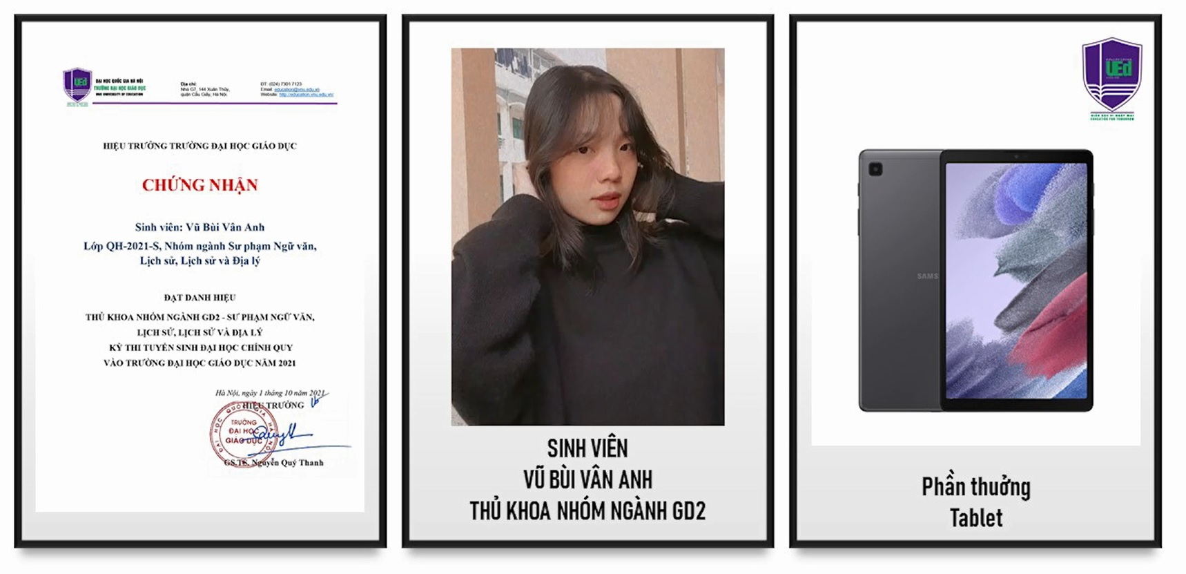 Tại Lễ Khai giảng Trường Đại học Giáo dục đã trao thưởng và vinh danh các tân sinh viên: 01 là Thủ khoa, 02 Á khoa của Trường và phần thưởng 01 máy tính xách tay/1 sinh viên; 05 Thủ khoa các nhóm ngành với phần thưởng là 01 máy tính bảng/1 sinh viên. Ngoài ra, 5 Tân sinh viên có hoàn cảnh khó khăn đạt kết quả cao trong Kỳ thi tuyển sinh THPT Nhà trường hỗ trợ 1 máy tính bảng và 5 triệu đồng tiền mặt. Kinh phí được trích từ nguồn ủng hộ và đóng góp của cán bộ, giảng viên và các tổ chức, cá nhân là đối tác của Trường.