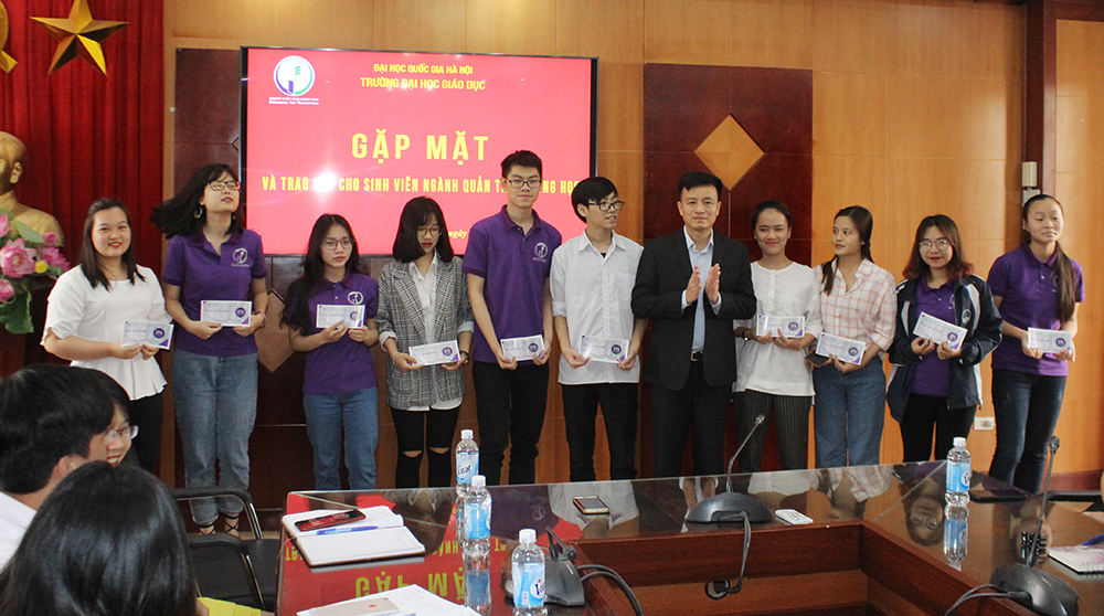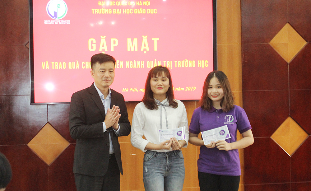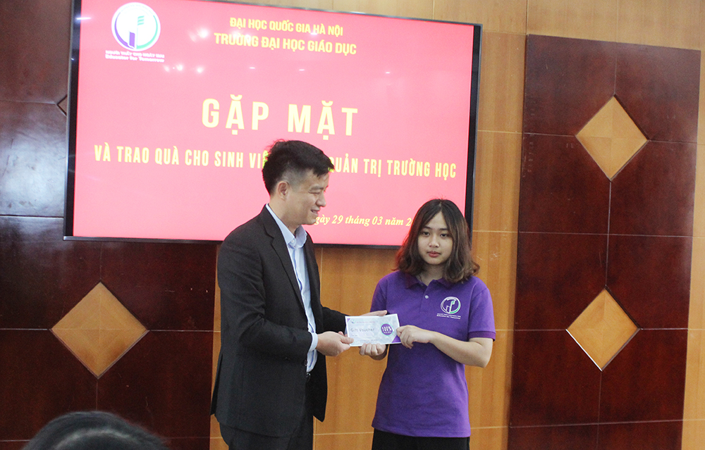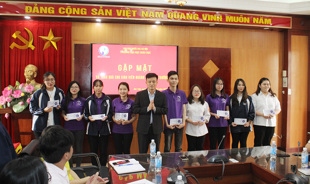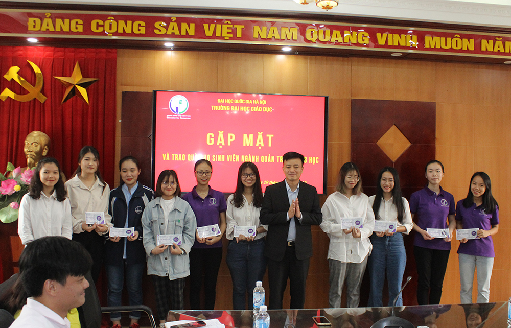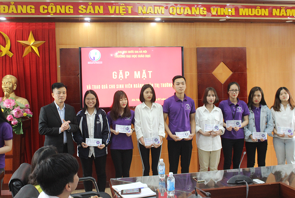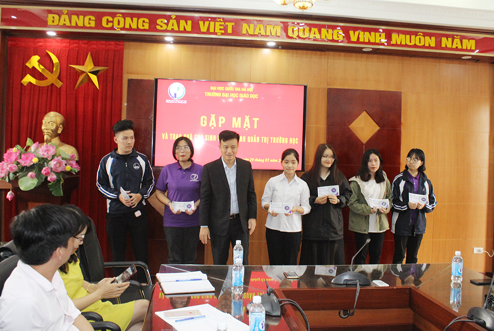 Tại Buổi gặp mặt, Phó Hiệu trưởng TS. Nguyễn Đức Huy thay mặt Ban Giám hiệu trường ĐH Giáo dục đã trao quà cho 100% sinh viên ngành Quản trị trường học. Trong đó có 1 sinh viên, 2 sinh viên và 44 sinh viên nhận được các phần tương ứng quà trị giá 100%, 50%, 25% học phí/tháng.