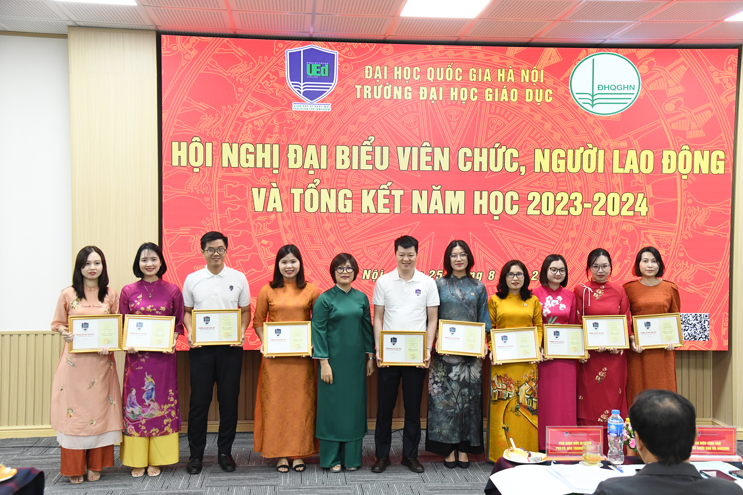 Đại biểu viên chức, Người lao động và Tổng kết năm học 2023-2024 của Trường Đại học Giáo dục đã thành công tốt đẹp. 100% các đại biểu tham gia hội nghị biểu quyết nhất trí thông qua với dự thảo Nghị quyết Hội nghị trong đó có các chỉ tiêu kế hoạch nhiệm vụ năm học 2024-2025. Hi vọng, với kết quả mà Hội nghị đã đạt được sẽ là tiền đề cho toàn thể viên chức và người lao động của trường Đại học Giáo dục thực hiện tốt nhiệm vụ trong năm học mới 2024-2025.