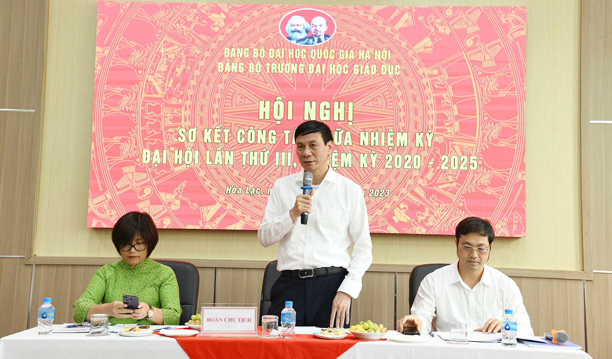 Tại Hội nghị đồng chí Phó bí thư Đảng uỷ, Phó Hiệu trưởng Trường ĐH Giáo dục PGS.TS. Phạm Văn Thuần đã trình bày dự thảo báo cáo sơ kết giữa nhiệm kỳ thực hiện nghị quyết đại hội Đảng bộ lần thứ III nhiệm kỳ 2020-2025. Báo cáo đã chỉ rõ những thành tựu đã đạt được trên các mảng công tác: Xây dựng Đảng, đào tạo, nghiên cứu khoa học và hợp tác phát triển, thanh tra – pháp chế và đảm bảo chất lượng giáo dục, học sinh – sinh viên, xây dựng bộ máy và phát triển đội ngũ, kế hoạch – tài chính, cơ sở vật chất, công đoàn – đoàn thanh niên.