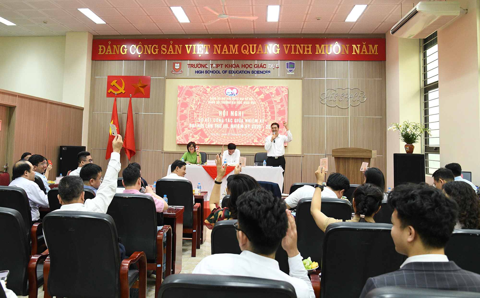 Toàn thể hội nghị cũng đã biểu quyết thông qua dự thảo nghị quyết Hội nghị sơ kết giữa nhiệm kỳ Đại hội Đảng bộ Trường ĐH Giáo dục lần thứ III, nhiệm kỳ 2020-2025.