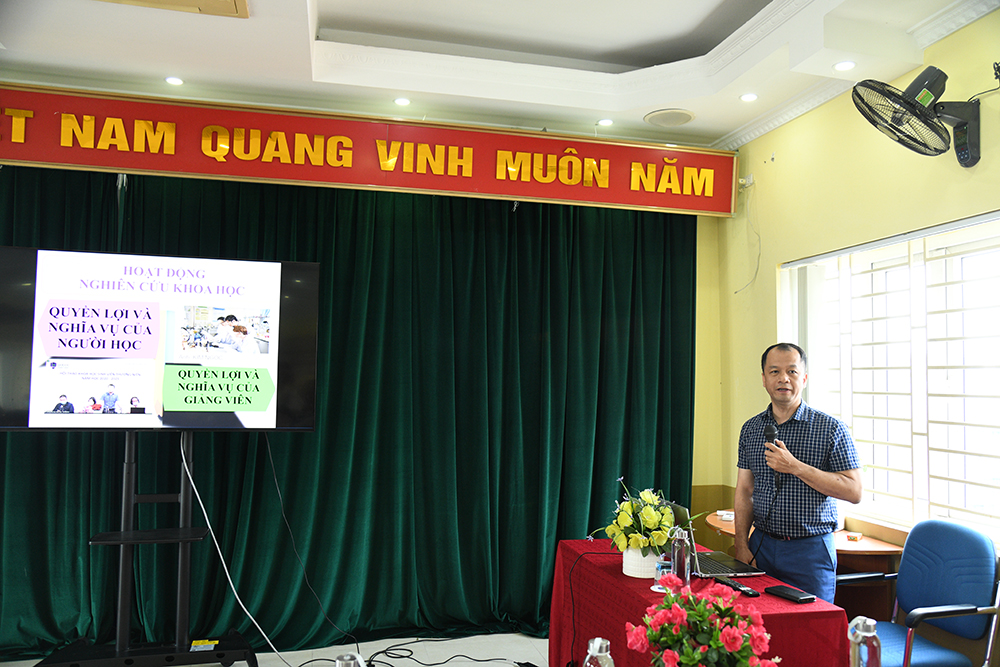 Trưởng phòng Đào tạo TS. Nguyễn Bá Ngọc trình bày những lợi ích và quyền lợi của sinh viên khi tham gia nghiên cứu khoa học