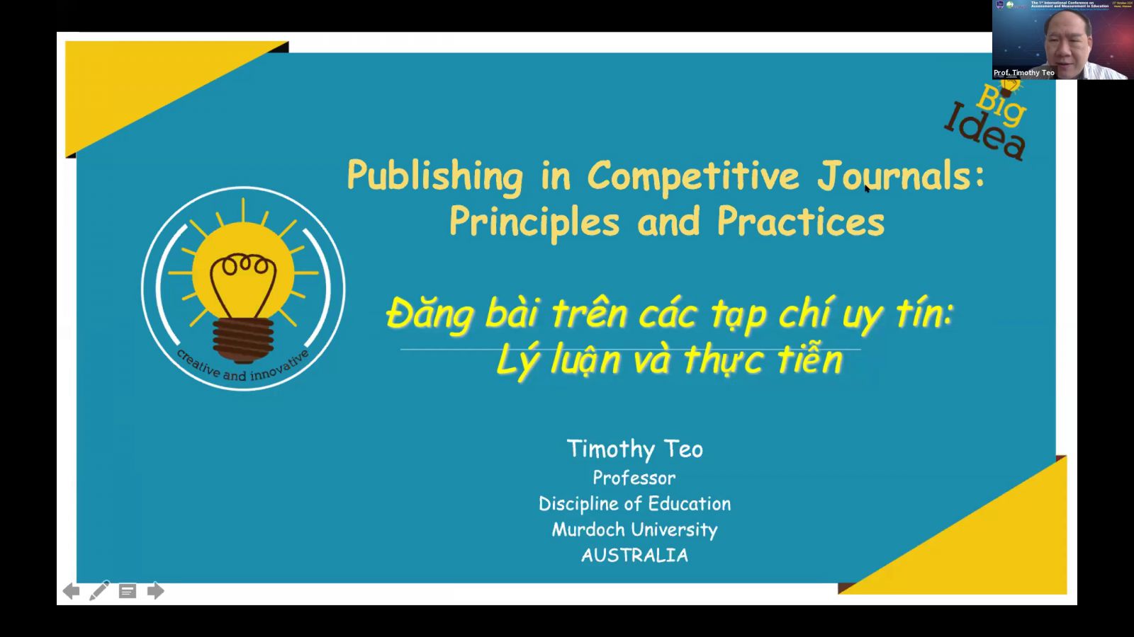 Một diễn giả khác là Giáo sư Timothy Teo từ Trường Đại học Murdoch, Australia có chia sẻ với người nghe về kinh nghiệm viết và đăng bài nghiên cứu trên các tạp chí uy tín trên thế giới. Bài trình bày nhằm mục đích giới thiệu những gì mà các biên tập viên và phản biện thường xem xét đối với các bản thảo được gửi đến các tạp chí uy tín. Dựa trên kinh nghiệm của bản thân với tư cách là Tổng biên tập của hai tạp chí quốc tế, là tác giả của gần 200 bài báo trên tạp chí uy tín và phản biện của nhiều tạp chí, Giáo sư Teo đã chia sẻ về những vấn đề chung và những khía cạnh cụ thể của quy trình đăng bài được hầu hết các tạp chí hàng đầu áp dụng. Ngoài công việc giảng dạy, nghiên cứu và xuất bản cũng là một nhiệm vụ quan trọng với các học giả, bởi vậy, bài trình bày nhận được rất nhiều sự quan tâm từ người tham dự.