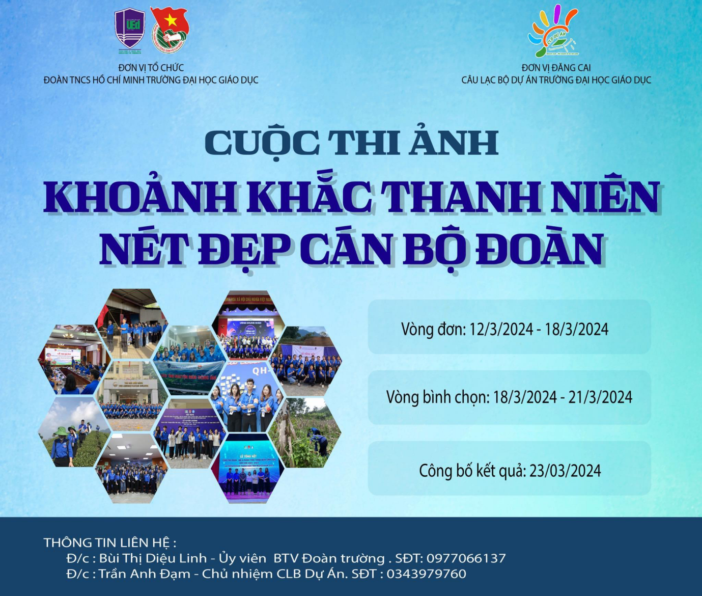 Sau nhiều ngày phát động, cuộc thi “Khoảnh khắc thanh niên - Nét đẹp cán bộ Đoàn” đã nhận được sự hưởng ứng tích cực từ nhiều đơn vị tổ chức, đoàn viên thanh niên, các cán bộ, giảng viên Trường Đại học Giáo dục. Mỗi tác phẩm dự thi là một thông điệp thể hiện sức sống đầy nhiệt huyết của các thí sinh khi khoác lên màu áo xanh Thanh niên Việt Nam thông qua các hoạt động tình nguyện, phong trào thi đua Đoàn, Hội.