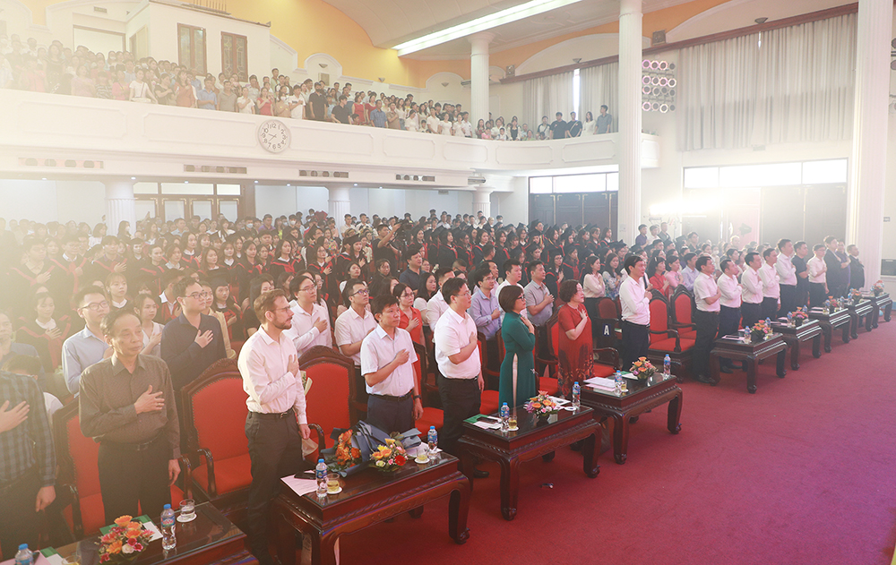 Bí thư Đảng uỷ - Hiệu trưởng GS.TS. Nguyễn Quý Thanh, Chủ tịch Hội đồng Trường PGS.TS. Nguyễn Thị Hương, Nguyên Hiệu trưởng sáng lập GS.TS. Nguyễn Thị Mỹ Lộc; Phó Hiệu trưởng PGS.TS. Phạm Văn Thuần, Phó Hiệu trưởng TS. Nguyễn Đức Huy tặng hoa chúc mừng Tân Phó Hiệu trưởng PGS.TS. Lê Thái Hưng