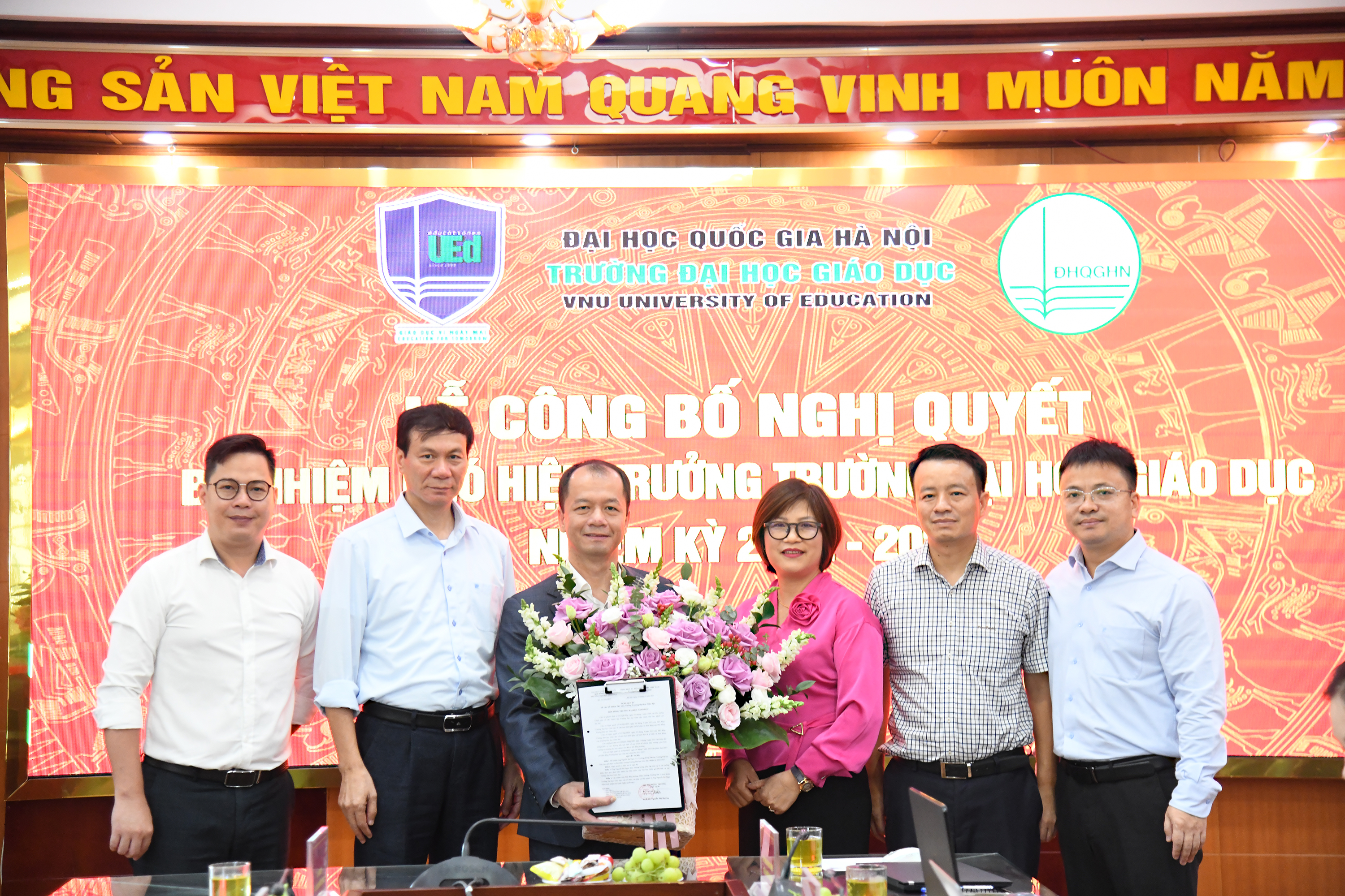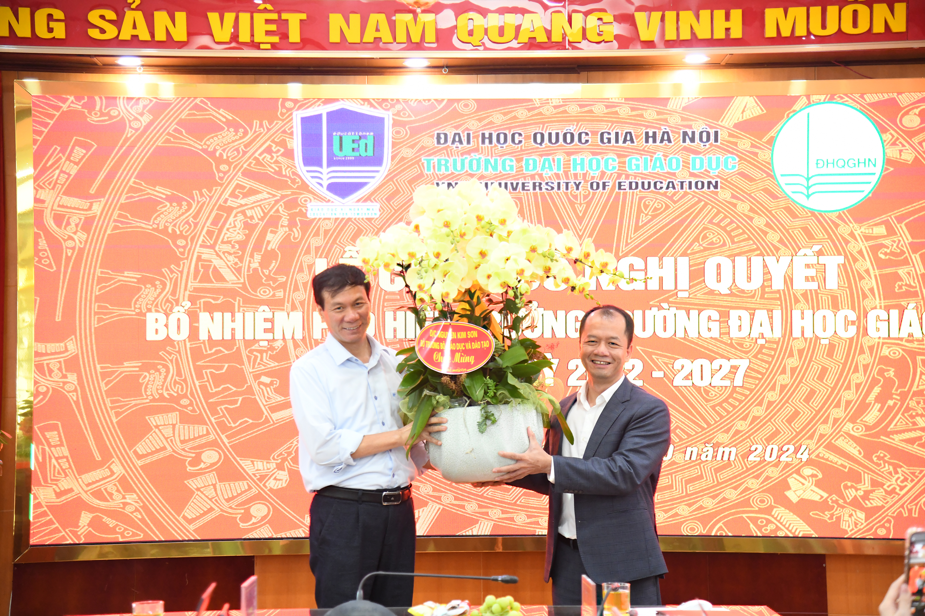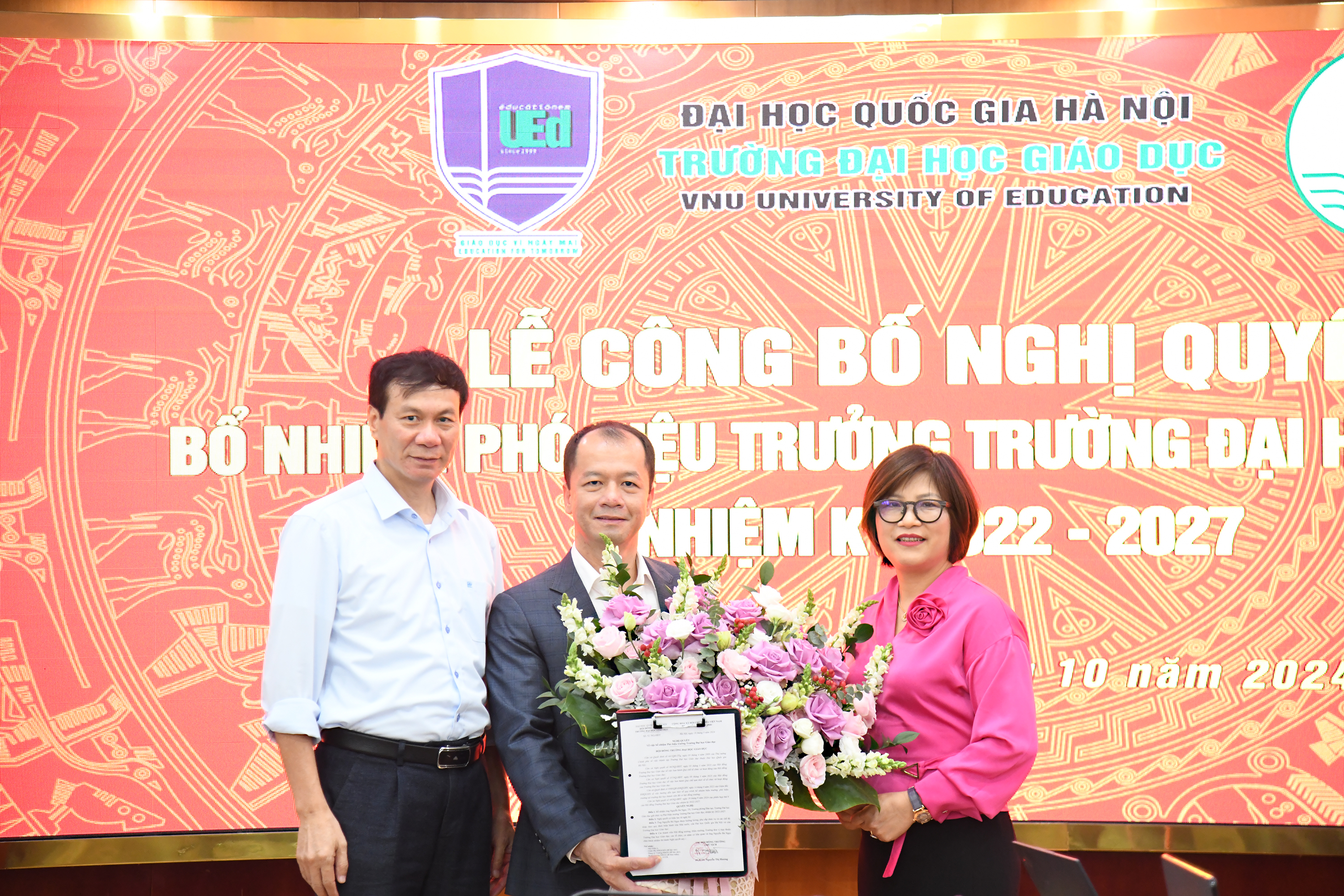 Hiệu trưởng và Chủ tịch Hội đồng Trường Đại học Giáo dục trao Nghị quyết và tặng hoa chúc mừng