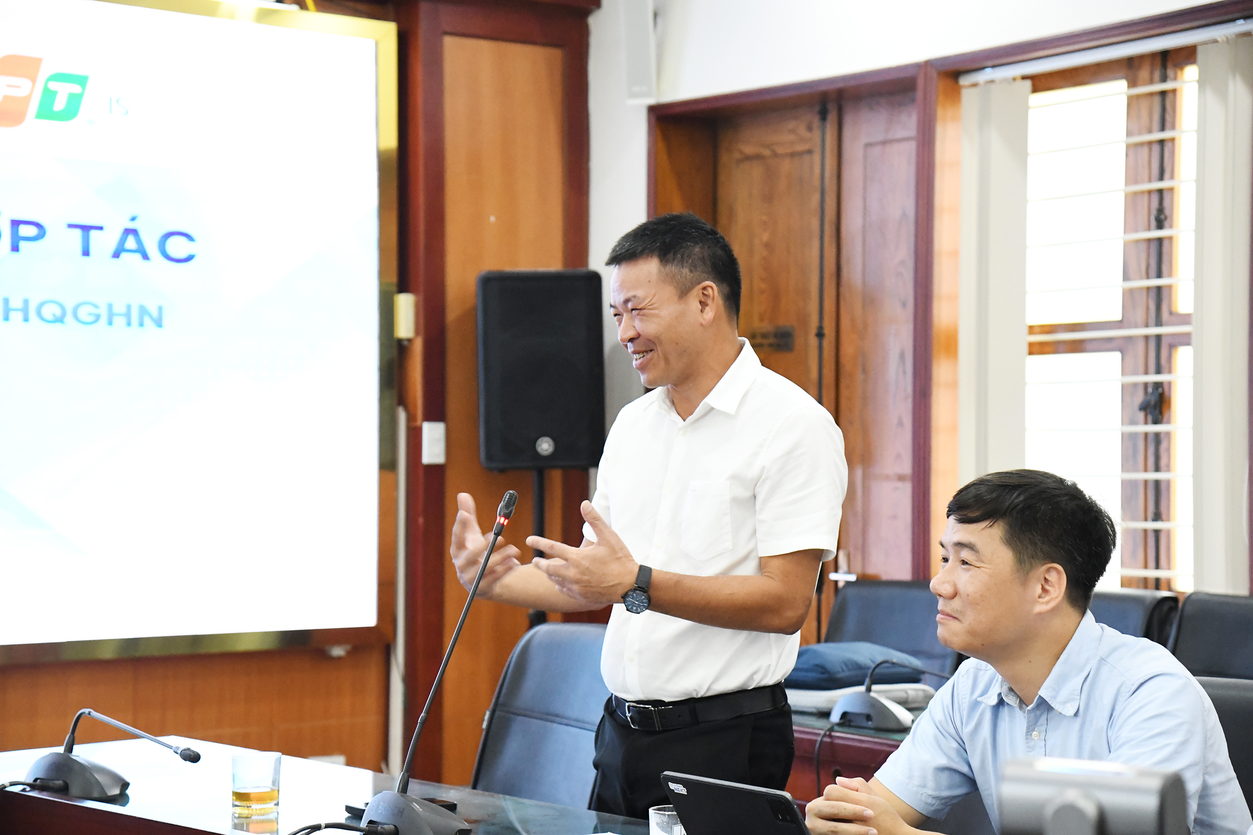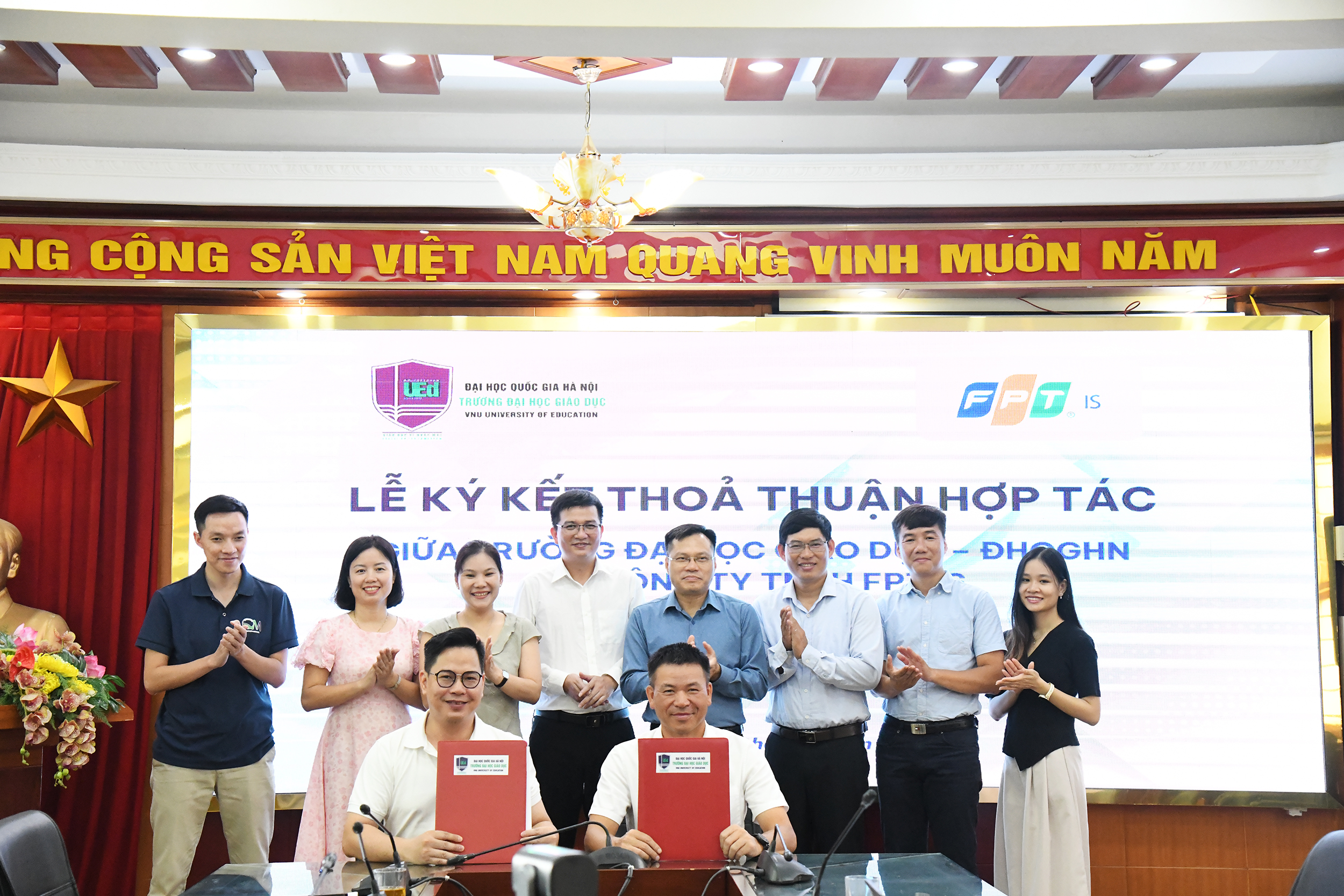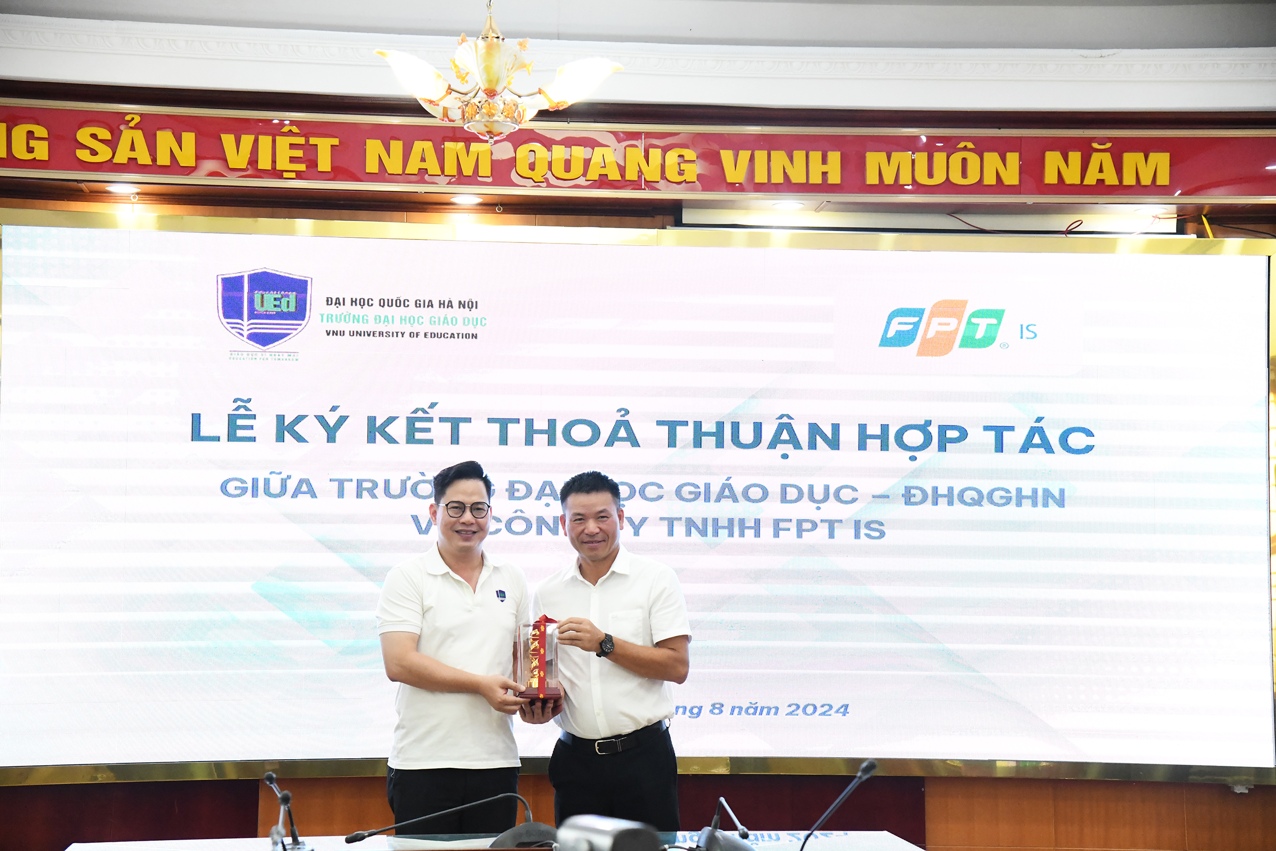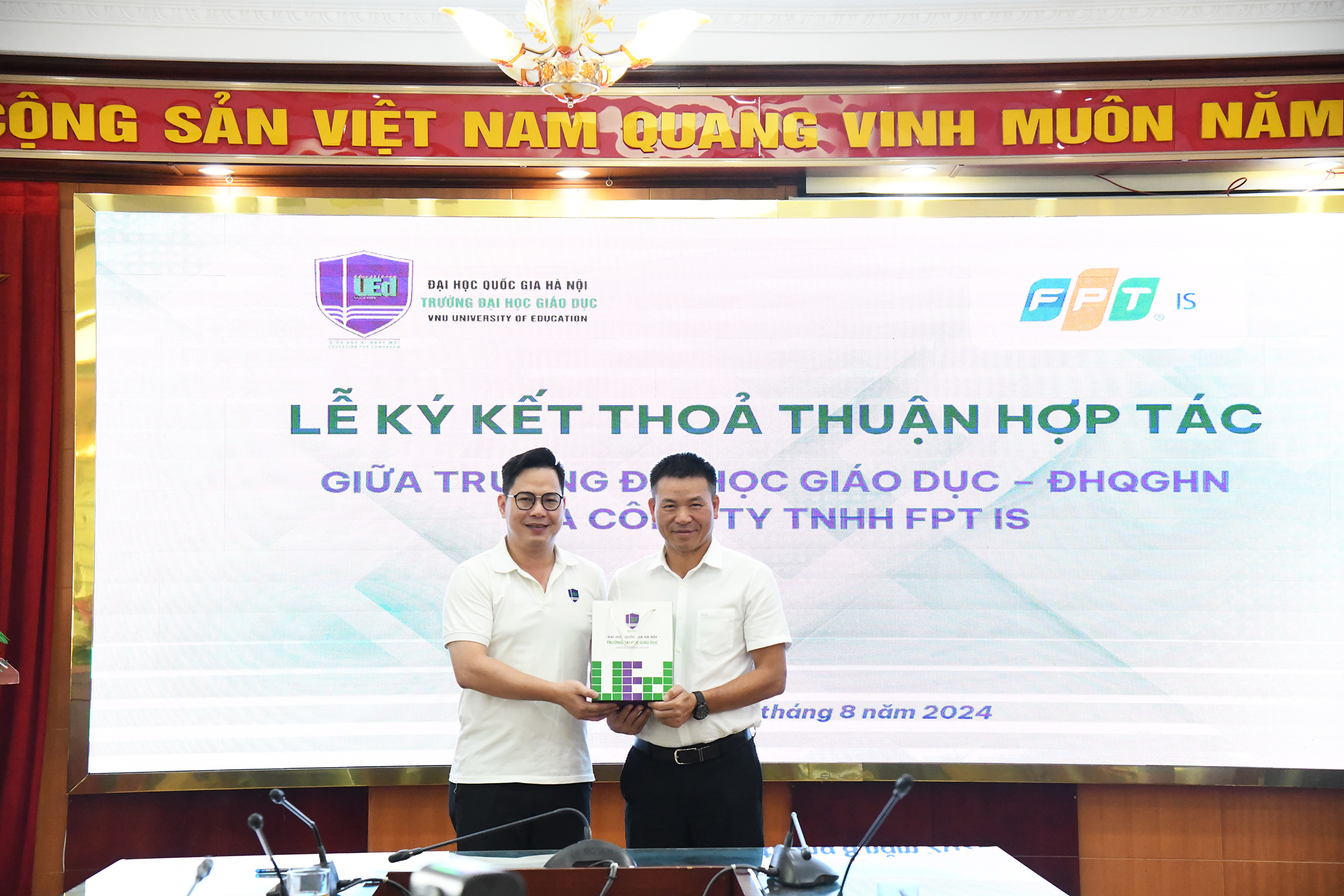 Dưới sự chứng kiến của các đại biểu tham dự, đại diện Trường Đại học Giáo dục - Phó Hiệu trưởng Trần Thành Nam và đại diện Công ty Trách nhiệm hữu hạn FPT IS ông Trần Phong Lãm đã cùng nhau ký kết biên bản thoả thuận hợp tác.