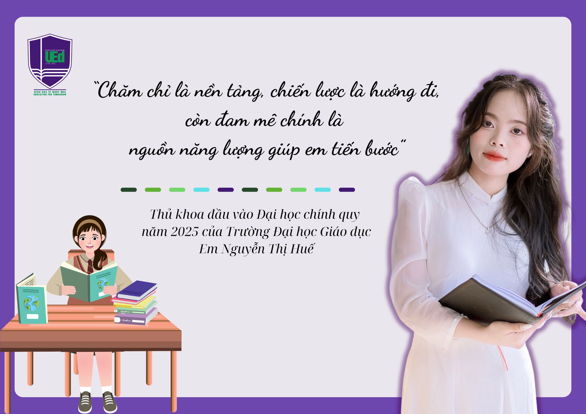 Lý do chọn ngành Giáo dục Tiểu học cũng bắt nguồn từ chính tình yêu ấy – tình yêu với tri thức, với trẻ em và với nghề dạy học. Huế chia sẻ: “Em tin đây là môi trường lý tưởng để em phát triển bản thân, học hỏi từ các thầy cô và bạn bè, từ đó trưởng thành hơn trong cả kiến thức lẫn tâm hồn”.