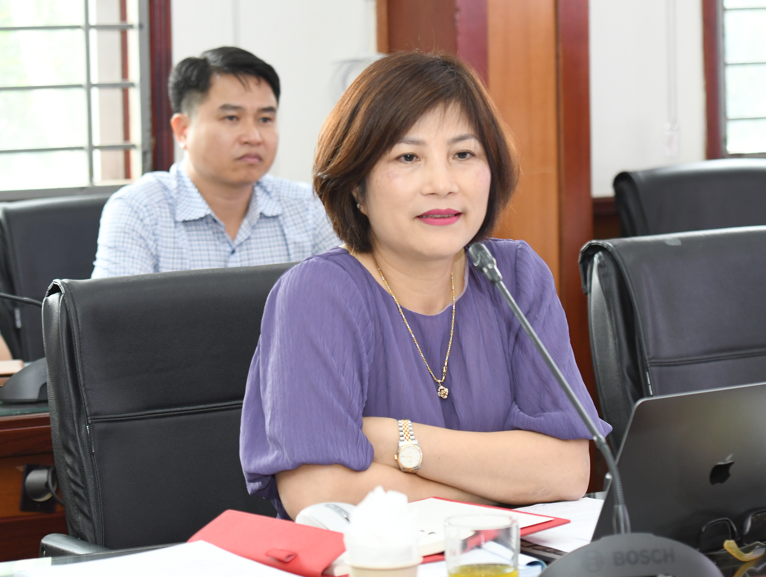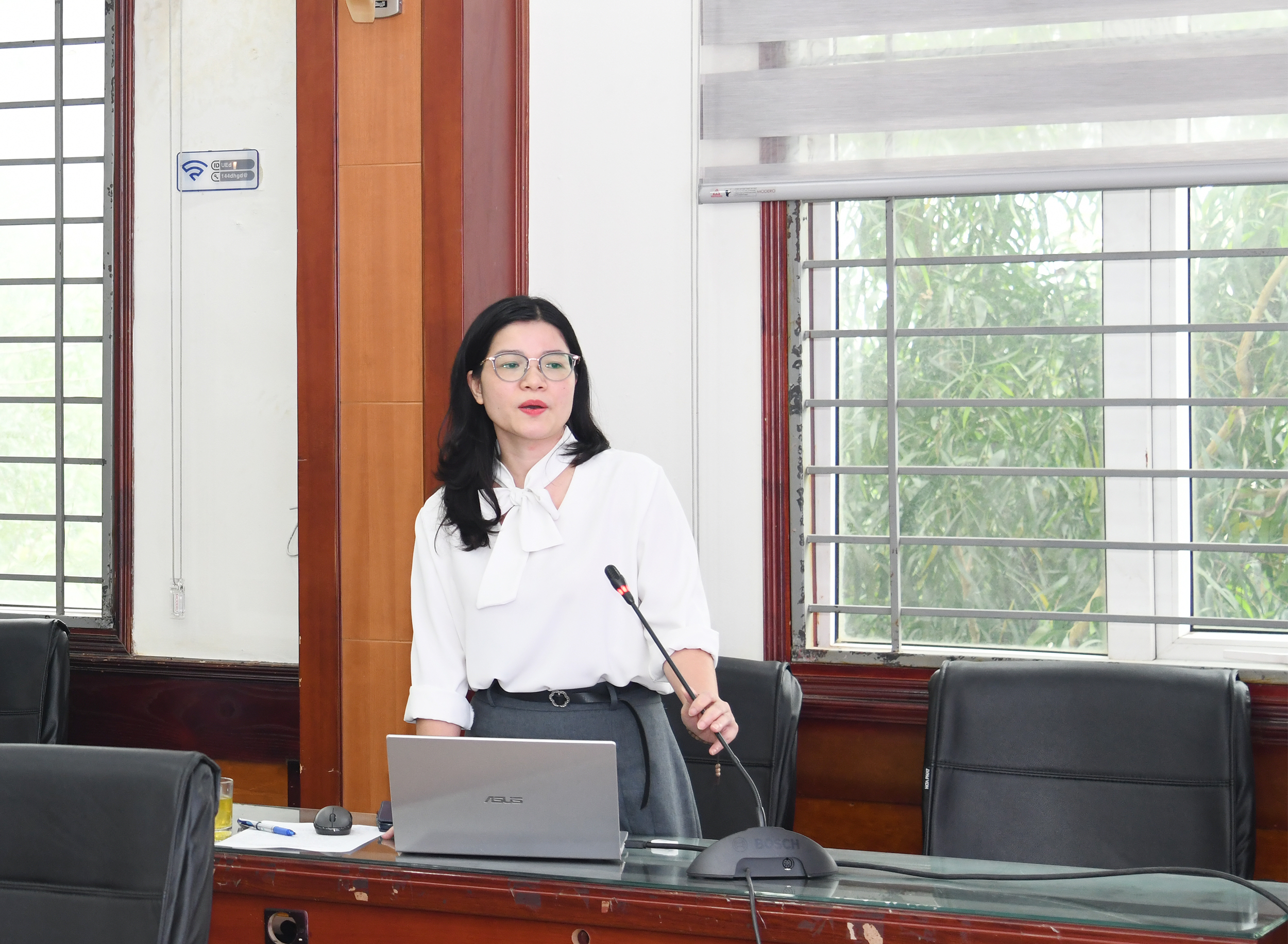 Được sự uỷ quyền của Hiệu trưởng Trường ĐHGD, TS. Nghiêm Thị Thanh, Trưởng phòng Tổ chức Cán bộ trình bày báo cáo nội dung Đề án vị trí việc làm giai đoạn 2024-2026 của Trường ĐHGD và Đề án thành lập Khoa Giáo dục sớm và Tiểu học thuộc Trường ĐHGD.