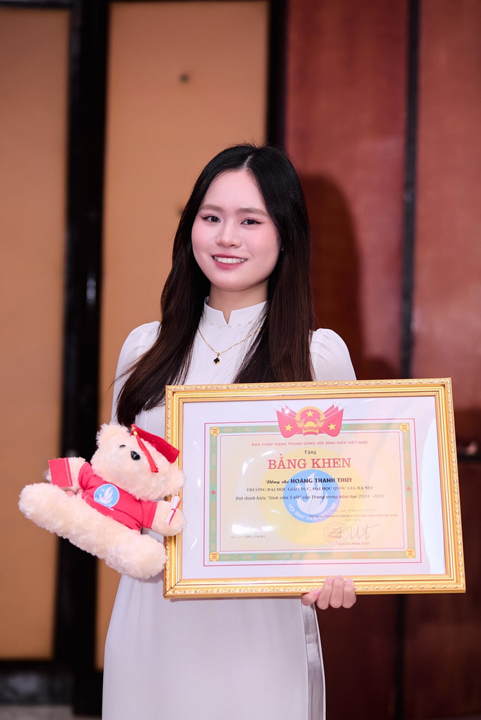 Hoàng Thanh Thúy - sinh viên năm cuối ngành Giáo dục Tiểu học thuộc Khoa Giáo dục sớm và tiểu học, Trường Đại học Giáo dục (Đại học Quốc gia Hà Nội), là một trong những gương mặt tiêu biểu của phong trào “Sinh viên 5 tốt”. Với điểm trung bình tích lũy 3.76/4.0 cùng thành tích nổi bật trong nghiên cứu khoa học và hoạt động phong trào, Thúy đã vinh dự được trao danh hiệu “Gương mặt trẻ tiêu biểu” cấp cơ sở và “Sinh viên 5 tốt” cấp Trung ương năm học 2024-2025.