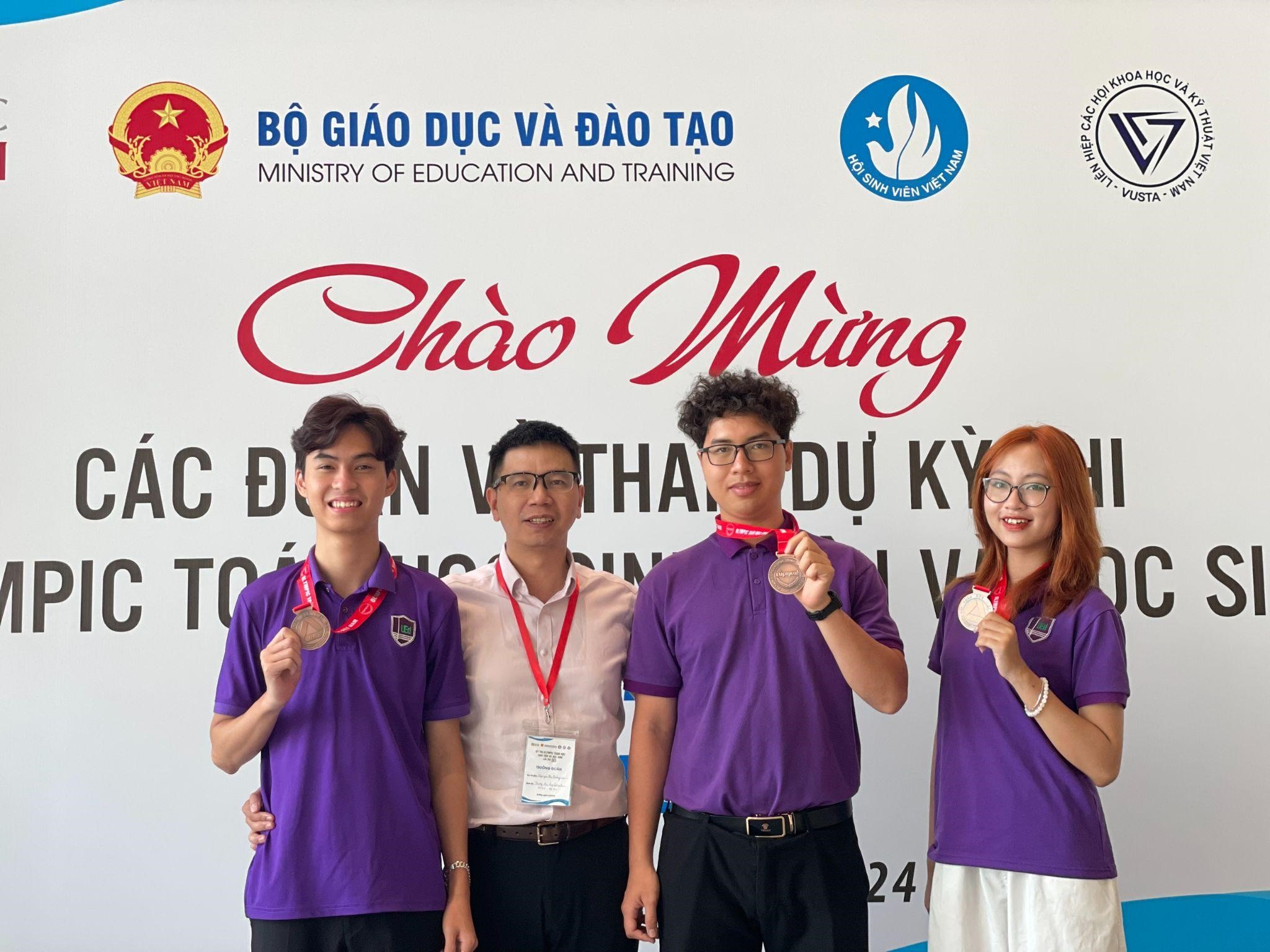 Phó Hiệu trưởng Nhà trường cùng đại diệnThầy/Cô lãnh đạo phòng Công tác Học sinh Sinh viên và Khoa Sư phạm trao huy chương cho 3 sinh viên đạt giải và giấy chứng nhận cho các sinh viên tham gia kỳ thi Olympic Toán học sinh sinh viên năm 2024