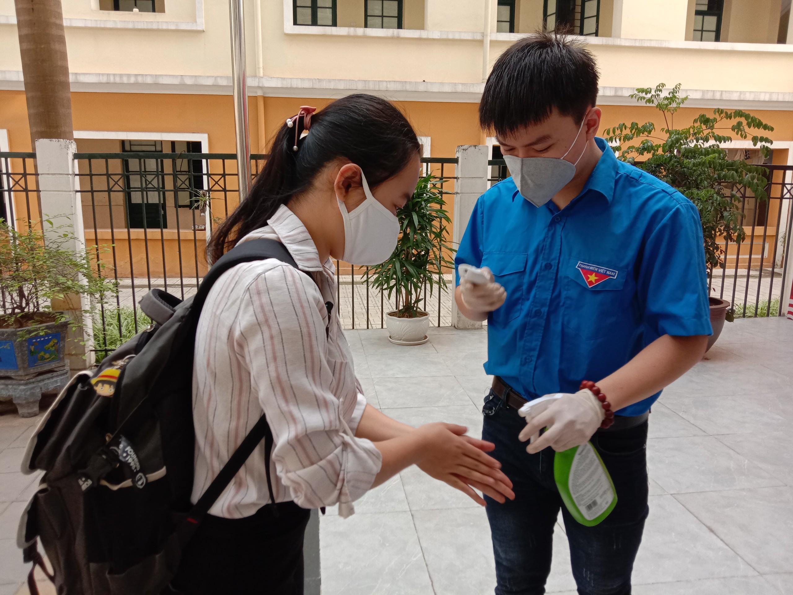 Tình nguyện viên khử khuẩn tay và đo thân nhiệt cho sinh viên trước khi vào khu vực giảng đường (Ảnh: SVTN)