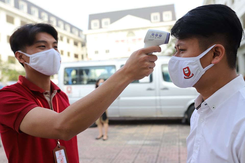 Tiến hành đo thân nhiệt cả giảng viên và giáo viên của Trường (Ảnh: HES)