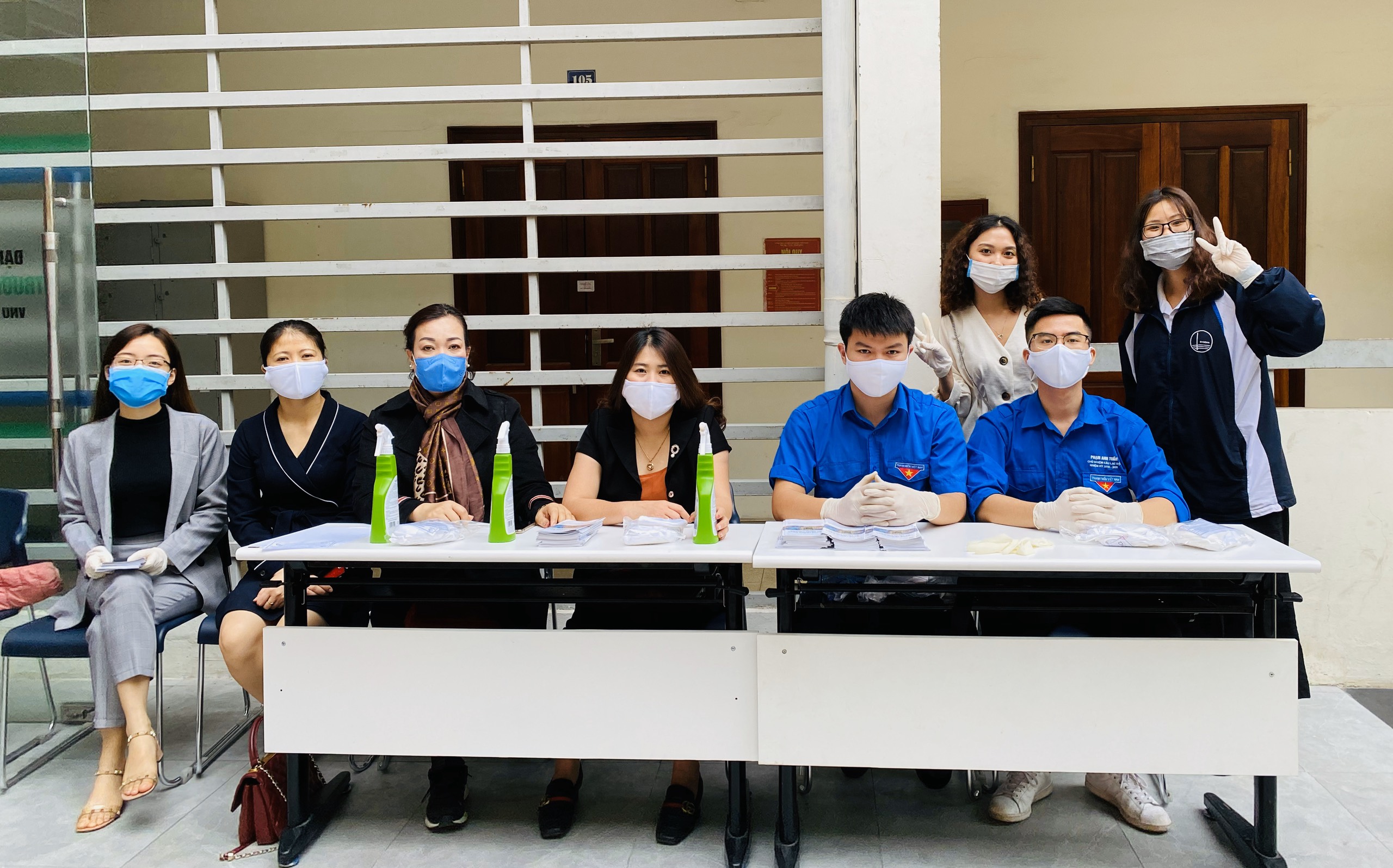Có mặt từ 6h45 sáng tại khu vực giảng đường Nhà C0, 182 Lương Thế Vinh, Thanh Xuân, Hà Nội, Phó hiệu trưởng Phạm Văn Thuần và Phó hiệu trưởng Nguyễn Đức Huy đã trực tiếp chỉ đạo các nhóm cán bộ, sinh viên hỗ trợ phát khẩu trang vải kháng khuẩn, tờ rơi hướng dẫn phòng dịch và sát khuẩn tay cho sinh viên trước khi vào lớp.