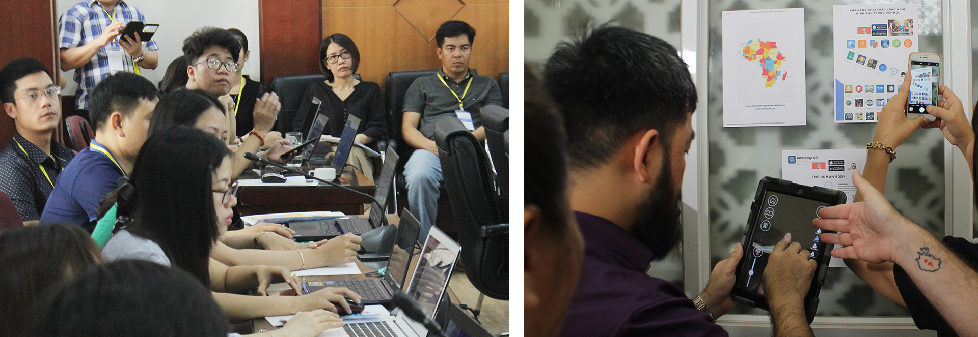 Nội dung của buổi tập huấn tập trung vào việc giới thiệu và thực hành sử dụng công nghệ thực tại ảo – VR (Virtual Reality); Thực tế tăng cường - AR (Augmented Reality), XR (Smartphone Reality) sử dụng điện thoại thông minh trong các bài giảng ở trường phổ thông.