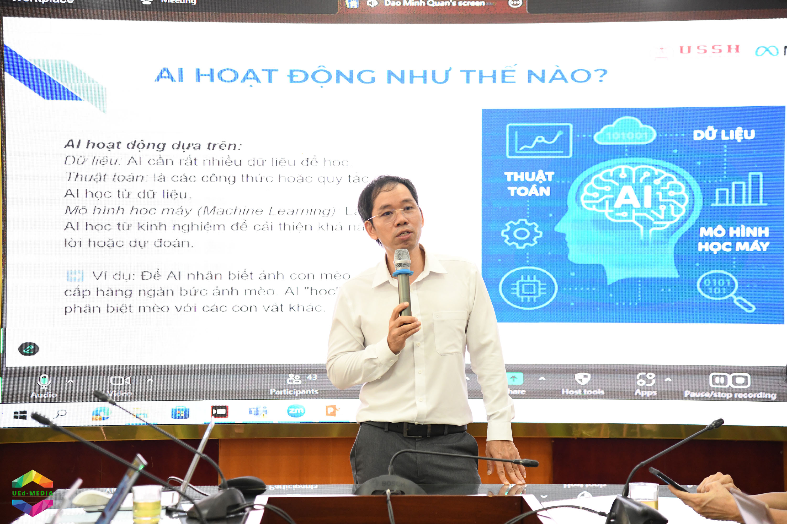 TS. Đào Minh Quân – Phó Trưởng khoa Thông tin Thư viện, Trường Đại học Khoa học xã hội và Nhân văn giới thiệu tổng quan về AI trong buổi tập huấn
