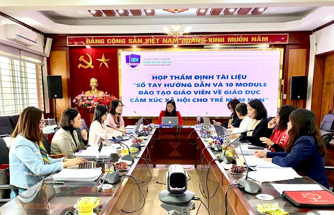 Tham gia cuộc họp có Chủ tịch Hội đồng – TS. Chu Thị Hồng Nhung - Phó trưởng Khoa Giáo dục sớm và Tiểu học, TS. Nguyễn Hồng Kiên - Giám đốc Trung tâm Hợp tác Đào tạo và Bồi dưỡng, Trường Đại học Giáo dục; TS. Cao Thị Hồng Nhung - Vụ Giáo dục Mầm non, Bộ Giáo dục và Đào tạo; bà Phan Thị Mùi - Đại diện của UNESCO Việt Nam cùng Hội đồng phản biện và các thành viên hội đồng khác.