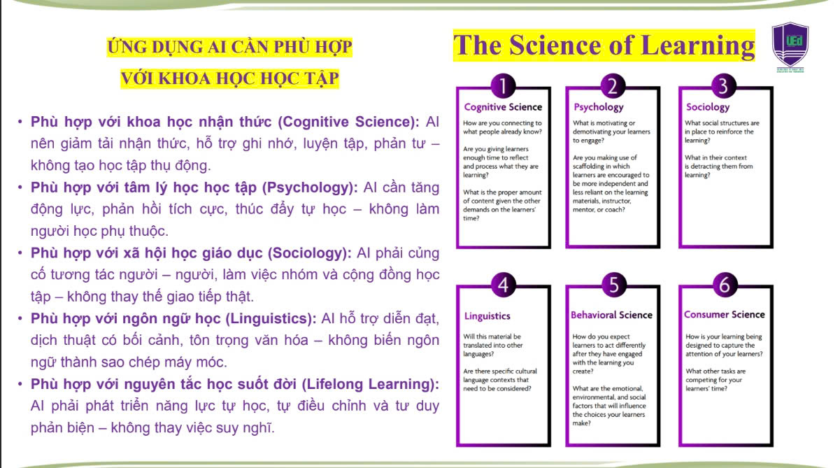 Chính vì vậy, AI chỉ có ý nghĩa khi được đặt trên nền tảng của khoa học học tập – Science of Learning, bao gồm ba trụ cột: Khoa học nhận thức, Tâm lý học học tập, và Khoa học thần kinh giáo dục.