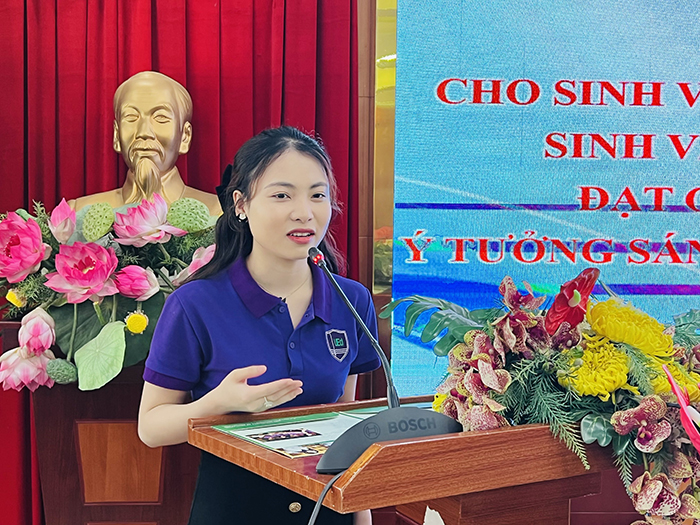 Đại diện nhóm sinh viên 3SR đạt giải trong Chương trình Tìm kiếm Ý tưởng sáng tạo vì một Đại dương không Nhựa 2022 - em Trần Thị Huyền Trang phát biểu.