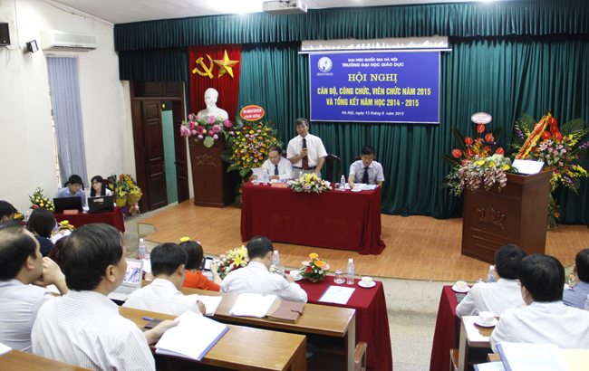 Tại hội nghị, Hiệu trưởng Trường ĐH Giáo dục Lê Kim Long cho biết, với tinh thần đoàn kết nhất trí, sự cố gắng, nỗ lực và quyết tâm cao của tập thể cán bộ, công chức, viên chức và người lao động; đồng thời được sự chỉ đạo sát sao của Đảng ủy, Ban giám đốc ĐHQGHN, Nhà trường đã cơ bản hoàn thành các chỉ tiêu kế hoạch năm học 2014 – 2015. Nhân dịp kỷ niệm 15 năm truyền thống và 05 năm thành lập, Trường ĐH Giáo dục đã vinh dự đón nhận Huân chương Lao động hạng Nhì do Nhà nước trao tặng. Đây là sự ghi nhận những thành tích đóng góp và cống hiến quý báu của tập thể và các cá nhân Nhà trường đối với sự phát triển của nền giáo dục và đào tạo nước nhà. Thành tích này cũng đánh dấu sự phấn đấu liên tục của Nhà trường trong quá trình xây dựng và phát triển.