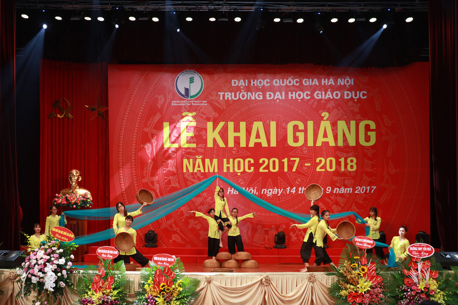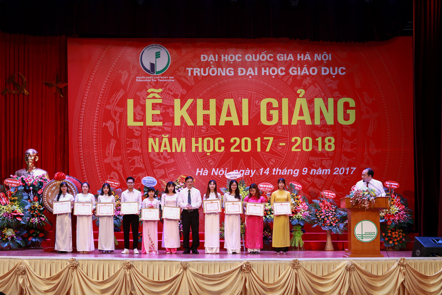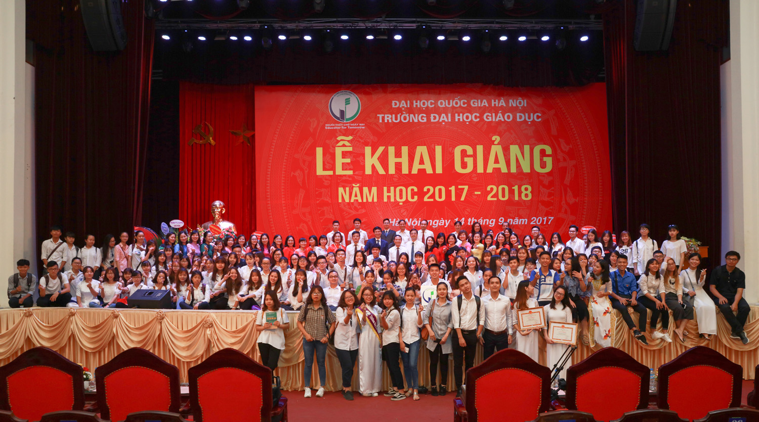 Hiệu trưởng Trường Đại học Giáo dục với nghi lễ đánh trống khai giảng năm học mới GS.TS Nguyễn Quý Thanh cho biết các em sinh viên có thể tham gia các nhóm nghiên cứu cùng cán bộ, giảng viên. Đồng thời, Hiệu trưởng khẳng định sẵn sàng lắng nghe những tâm tư, nguyện vọng và phản ánh của các em. Phát biểu tại buổi lễ, Phó Giám đốc ĐHQGHN Nguyễn Hồng Sơn cho rằng các tân sinh viên Trường ĐH Giáo dục nên tự hào vì trở thành sinh viên một trong 7 trường đại học thành viên của ĐHQGHN – đại học đa ngành, đa lĩnh vực, chất lượng cao hàng đầu Việt Nam, đứng thứ 139 các trường đại học hàng đầu châu Á (theo bảng xếp hạng QS năm 2016). Do đó, các em hãy phát huy thế mạnh, phấn đấu rèn luyện, học tập, nghiên cứu thật tốt để góp phần duy trì vị thế của ĐHQGHN. Phó Giám đốc ĐHQGHN cũng lưu ý các em cần nhận thức rõ vai trò quan trọng của giáo dục với sự nghiệp tương lai của các em nói riêng cũng như sự phát triển đất nước nói chung, từ đó chuyển thành hành động cụ thể trong quá trình học tập. Trong bối cảnh cuộc cách mạng công nghiệp 4.0 đang phát triển mạnh mẽ, thế giới đang thay đổi nhanh chóng, Phó Giám đốc Nguyễn Kim Sơn mong các em sinh viên bên cạnh những kiến thức trong trường đại học cần trau dồi thêm những kỹ năng như kỹ năng giao tiếp, kỹ năng tiếp nhận và xử lý thông tin, kỹ năng thích nghi với những thay đổi … Trong thời gian tới, Phó Giám đốc ĐHQGHN Nguyễn Hồng Sơn yêu cầu Trường ĐH Giáo dục cần: Tạo dựng môi trường học tập, giảng dạy và nghiên cứu phù hợp, thuận lợi cho cả thầy và trò, từ cơ sở vật chất, tài chính, nhân lực đến điều kiện khác. Rà soát lại quy hoạch ngành, chuyên ngành, hướng tới mở mới các ngành, chuyên ngành theo 3 hướng cơ bản: ngành mới, đặc biệt, đáp ứng xu hướng phát triển của cách mạng công nghiệp 4.0; ngành liên thông, liên kết trong ĐHQGHN; ngành đào tạo chất lượng cao và tự chủ. Nâng cao chất lượng đào tạo, đổi mới công tác thực tập, thực tế, công tác trao đổi sinh viên, đặc biệt sinh viên quốc tế; chú trọng đào tạo kỹ năng mềm cho sinh viên; gắn giảng dạy lý thuyết với thực tiễn, tạo nhiều cơ hội việc làm cho sinh viên trong tương lai cả ở trong nước và quốc tế. Đẩy mạnh nghiên cứu khoa học, gắn nghiên cứu khoa học với đào tạo và thực tiễn; xây dựng các nhóm nghiên cứu trong đó có sự tham gia của cả thầy và trò. Phó Giám đốc gợi ý, có thể sử dụng cách thức nghiên cứu thông qua dự án (project-based), nhằm giúp các em sinh viên trau dồi kiến thức và kỹ năng qua các hoạt động thực thế khi tham gia dự án, từ đó có thể tự học, tự nhận thức được kỹ năng nào là thực sự cần thiết và hữu ích. Tại Lễ khai giảng, Ban Giám hiệu Trường ĐH Giáo dục đã trao khen thưởng cho các sinh viên đạt thành tích xuất sắc trong năm học 2016 – 2017.