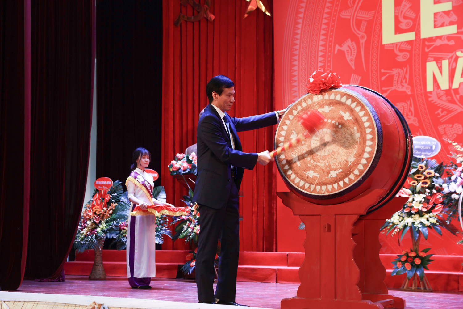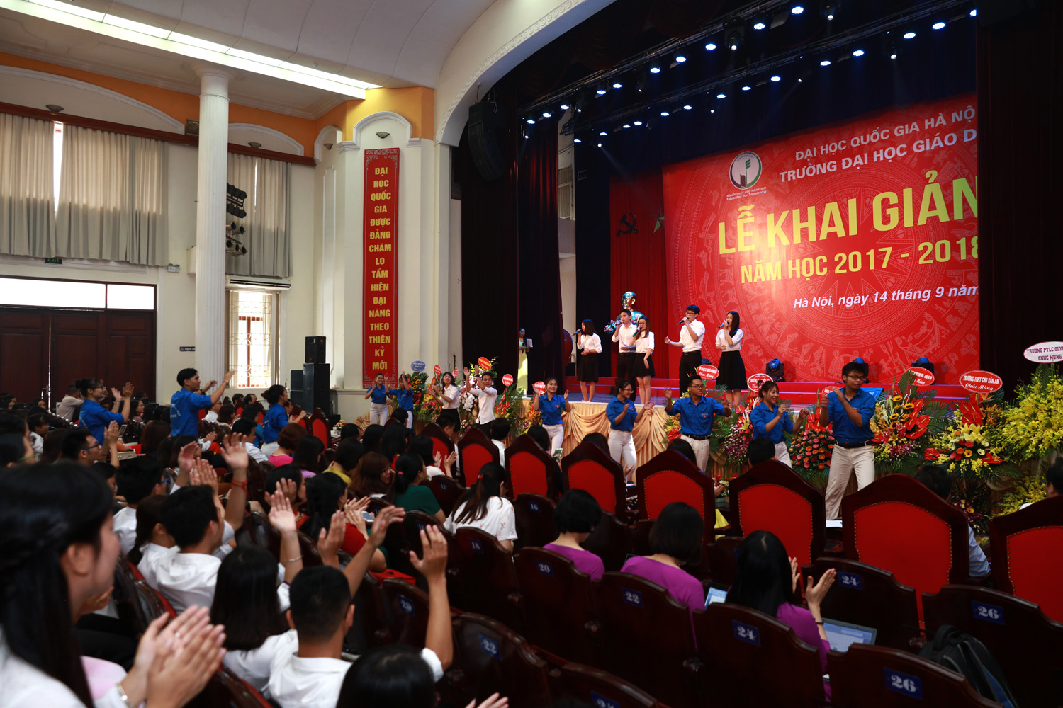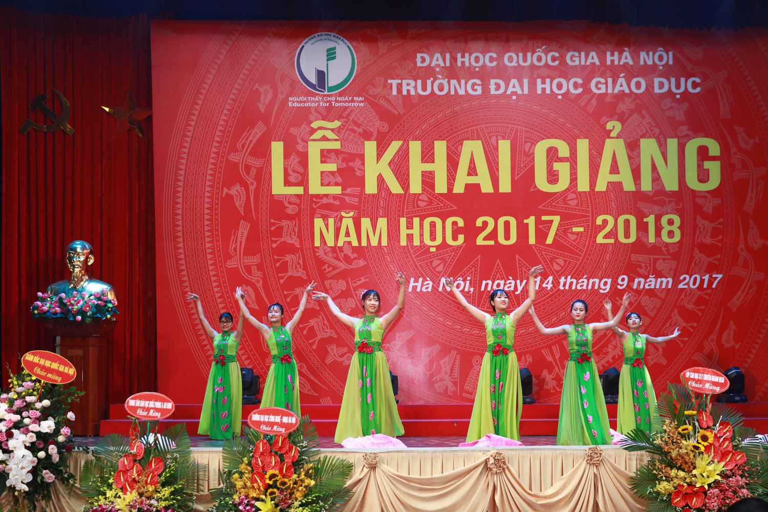 Hiệu trưởng Trường Đại học Giáo dục với nghi lễ đánh trống khai giảng năm học mới GS.TS Nguyễn Quý Thanh cho biết các em sinh viên có thể tham gia các nhóm nghiên cứu cùng cán bộ, giảng viên. Đồng thời, Hiệu trưởng khẳng định sẵn sàng lắng nghe những tâm tư, nguyện vọng và phản ánh của các em. Phát biểu tại buổi lễ, Phó Giám đốc ĐHQGHN Nguyễn Hồng Sơn cho rằng các tân sinh viên Trường ĐH Giáo dục nên tự hào vì trở thành sinh viên một trong 7 trường đại học thành viên của ĐHQGHN – đại học đa ngành, đa lĩnh vực, chất lượng cao hàng đầu Việt Nam, đứng thứ 139 các trường đại học hàng đầu châu Á (theo bảng xếp hạng QS năm 2016). Do đó, các em hãy phát huy thế mạnh, phấn đấu rèn luyện, học tập, nghiên cứu thật tốt để góp phần duy trì vị thế của ĐHQGHN. Phó Giám đốc ĐHQGHN cũng lưu ý các em cần nhận thức rõ vai trò quan trọng của giáo dục với sự nghiệp tương lai của các em nói riêng cũng như sự phát triển đất nước nói chung, từ đó chuyển thành hành động cụ thể trong quá trình học tập. Trong bối cảnh cuộc cách mạng công nghiệp 4.0 đang phát triển mạnh mẽ, thế giới đang thay đổi nhanh chóng, Phó Giám đốc Nguyễn Kim Sơn mong các em sinh viên bên cạnh những kiến thức trong trường đại học cần trau dồi thêm những kỹ năng như kỹ năng giao tiếp, kỹ năng tiếp nhận và xử lý thông tin, kỹ năng thích nghi với những thay đổi … Trong thời gian tới, Phó Giám đốc ĐHQGHN Nguyễn Hồng Sơn yêu cầu Trường ĐH Giáo dục cần: Tạo dựng môi trường học tập, giảng dạy và nghiên cứu phù hợp, thuận lợi cho cả thầy và trò, từ cơ sở vật chất, tài chính, nhân lực đến điều kiện khác. Rà soát lại quy hoạch ngành, chuyên ngành, hướng tới mở mới các ngành, chuyên ngành theo 3 hướng cơ bản: ngành mới, đặc biệt, đáp ứng xu hướng phát triển của cách mạng công nghiệp 4.0; ngành liên thông, liên kết trong ĐHQGHN; ngành đào tạo chất lượng cao và tự chủ. Nâng cao chất lượng đào tạo, đổi mới công tác thực tập, thực tế, công tác trao đổi sinh viên, đặc biệt sinh viên quốc tế; chú trọng đào tạo kỹ năng mềm cho sinh viên; gắn giảng dạy lý thuyết với thực tiễn, tạo nhiều cơ hội việc làm cho sinh viên trong tương lai cả ở trong nước và quốc tế. Đẩy mạnh nghiên cứu khoa học, gắn nghiên cứu khoa học với đào tạo và thực tiễn; xây dựng các nhóm nghiên cứu trong đó có sự tham gia của cả thầy và trò. Phó Giám đốc gợi ý, có thể sử dụng cách thức nghiên cứu thông qua dự án (project-based), nhằm giúp các em sinh viên trau dồi kiến thức và kỹ năng qua các hoạt động thực thế khi tham gia dự án, từ đó có thể tự học, tự nhận thức được kỹ năng nào là thực sự cần thiết và hữu ích. Tại Lễ khai giảng, Ban Giám hiệu Trường ĐH Giáo dục đã trao khen thưởng cho các sinh viên đạt thành tích xuất sắc trong năm học 2016 – 2017.