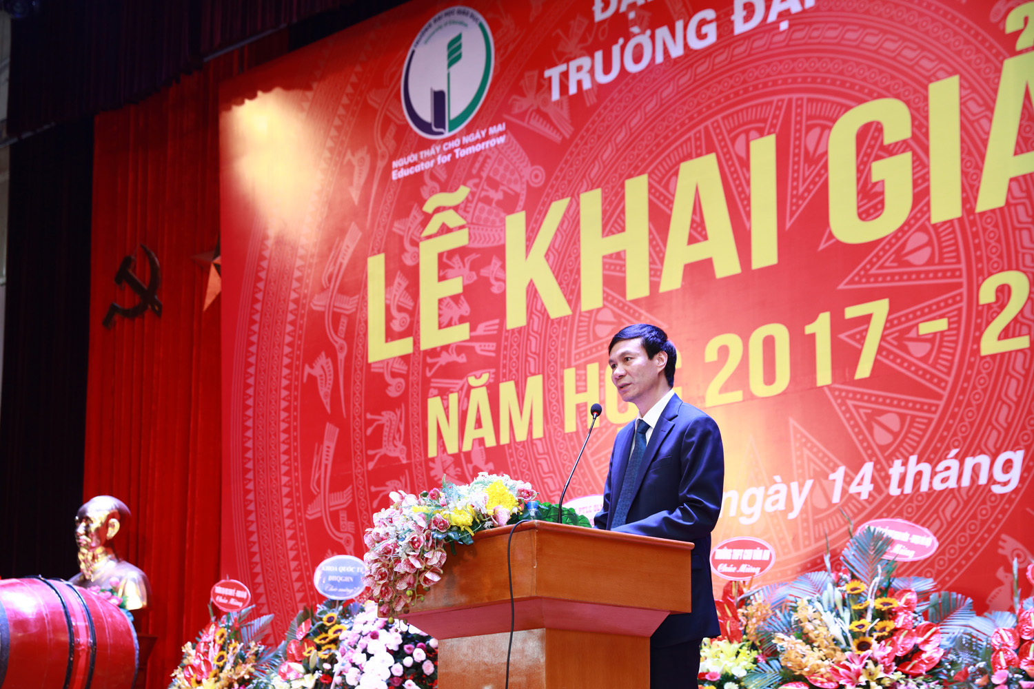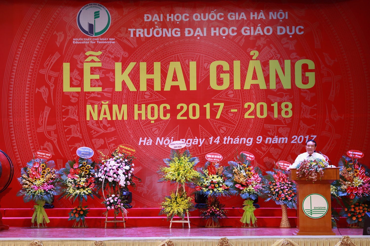 Phó Giám đốc ĐHQGHN Nguyễn Hồng Sơn phát biểu chào mừng tại lễ khai giảng Phó Giám đốc ĐHQGHN Nguyễn Hồng Sơn dự và phát biểu tại buổi lễ. Thay mặt Trường ĐH Giáo dục, GS.TS Nguyễn Quý Thanh – Hiệu trưởng Nhà trường đã đọc diễn văn và đánh trống khai giảng. Giới thiệu với các tân sinh viên về Trường, Hiệu trưởng Nhà trường khẳng định, các em sẽ được học tập và nghiên cứu với các giảng viên, nhà khoa học hàng đầu ĐHQGHN, cơ sở vật chất hiện đại và trong một môi trường khoa học chuyên nghiệp, chất lượng cao. Bên cạnh các nguồn lực cơ sở vật chất dùng chung của ĐHQGHN, Trường ĐH Giáo dục đã đầu tư 3 phòng thí nghiệm Lý, Hóa, Sinh để phục vụ các nghiên cứu cũng như các bài thí nghiệm. Cùng với đó, Trường cũng có những phòng thực hành đặc thù: trung tâm tư vấn học đường, phòng lab nghiên cứu phát triển trí tuệ, Trung tâm nghiên cứu tư vấn hướng nghiệp và tư vấn tâm lý…
