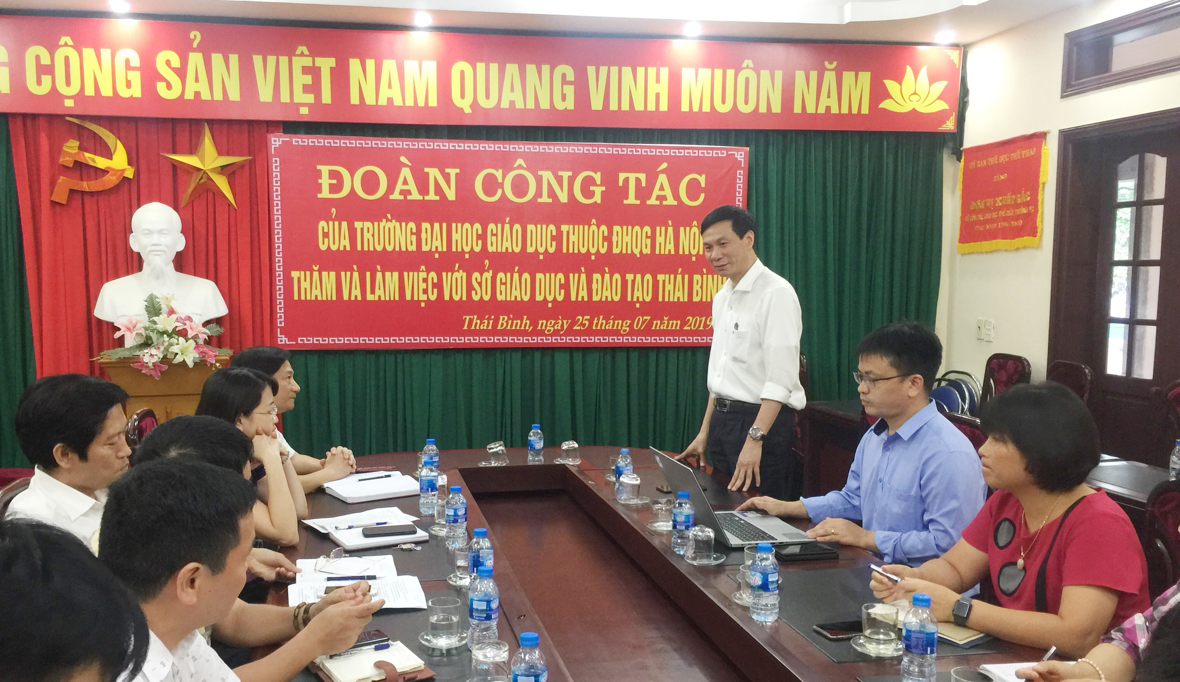 Chủ trì buổi làm việc, về phía Sở Giáo dục và Đào tạo tỉnh Thái Bình có đồng chí Nguyễn Viết Hiển – Giám đốc, đồng chí Trần Bích Vân – Phó Giám đốc, cùng lãnh đạo các Phòng chức năng.