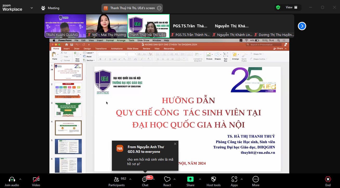 Do ảnh hưởng của cơn bão Yagi, Trường Đại học Giáo dục tổ chức Tuần lễ Hội nhập theo hình thức trực tuyến để đảm bảo an toàn cho các sinh viên. Trong 2 ngày diễn ra Tuần lễ hội nhập, các tân sinh viên khoá QH-2024-S đã được giới thiệu về các nội dung: (1) Giới thiệu chung về ĐHQGHN, về Trường Đại học Giáo dục; Hướng dẫn phương pháp học tập bậc đại học; Kỹ năng chăm sóc sức khoẻ tinh thần cho sinh viên năm nhất; (2) Giới thiệu quy chế đào tạo tại ĐHQGHN và Phổ biến một số văn bản liên quan; (3) Công tác an ninh, trật tự đối với học sinh, sinh viên; (4) Nội dung hướng dẫn “Học tập và làm theo tư tưởng, đạo đức, phong cách Hồ Chi Minh” chuyên đề năm 2024; (5) Giới thiệu về thư viện, cách thức khai thác tài liệu thư viện ĐHQGHN; (6) Giới thiệu Quy chế công tác sinh viên tại ĐHQGHN và phổ biến một số văn bản pháp quy liên quan đến quyền lợi và nghĩa vụ của sinh viên; (7) Tư vấn hướng nghiệp, chọn ngành, chọn nghề cho sinh viên; (8) Phổ biến chương trình công tác của Đoàn Thanh niên năm học 2024-2025.