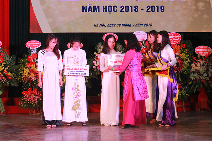 Phó Hiệu trưởng Nguyễn Thị Hương trao thưởng cho sinh viên có thành tích học tập xuất sắc trong năm học 2017-2018