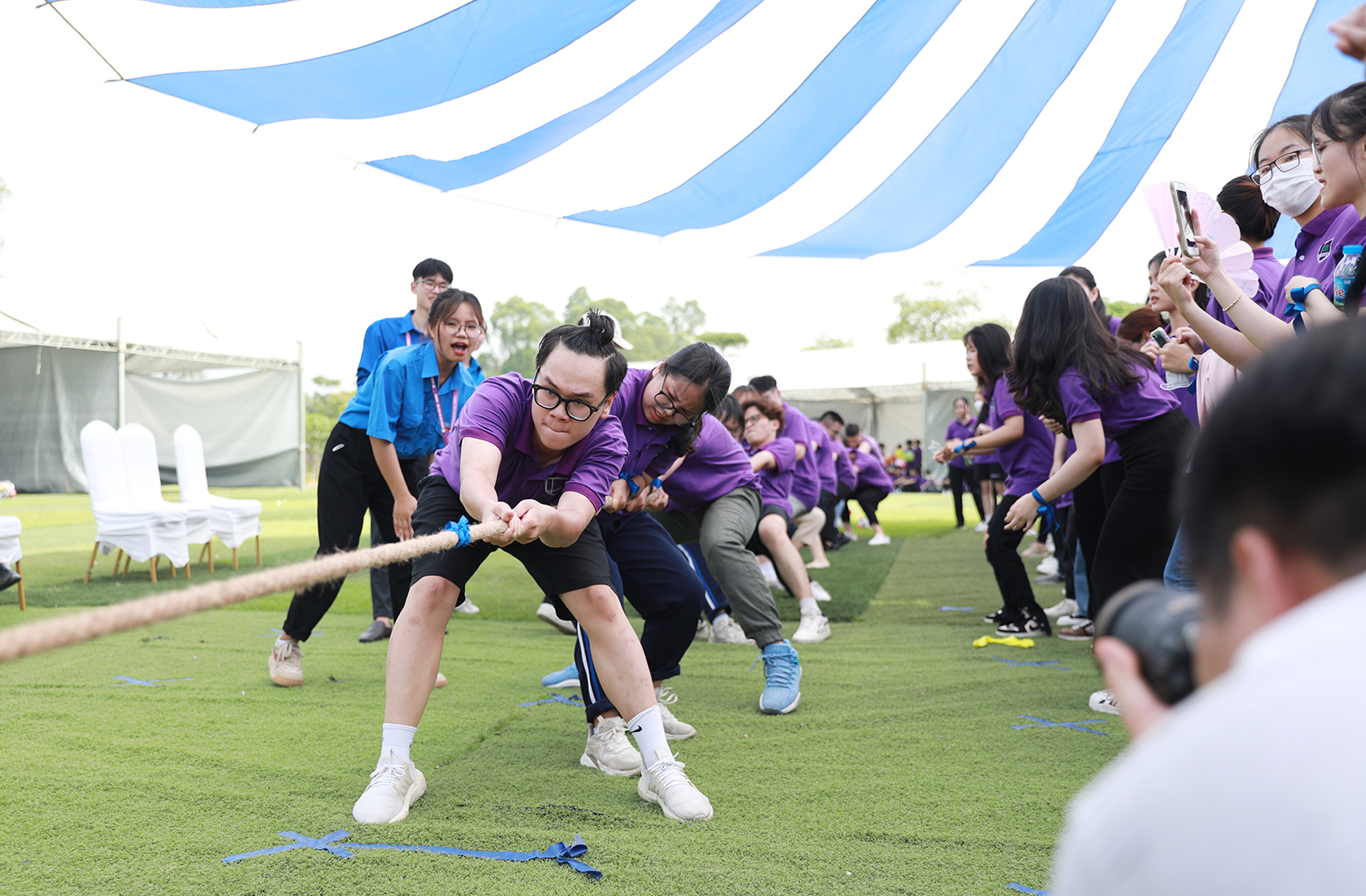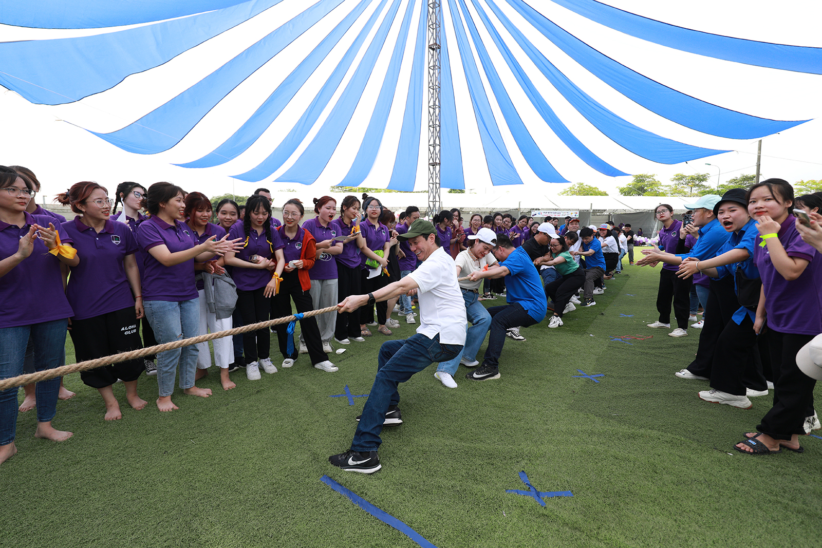 Đội trưởng đội kéo co của cán bộ, giảng viên - Hiệu trường GS.TS. Nguyễn Quý Thanh (đầu tiên, áo trắng)