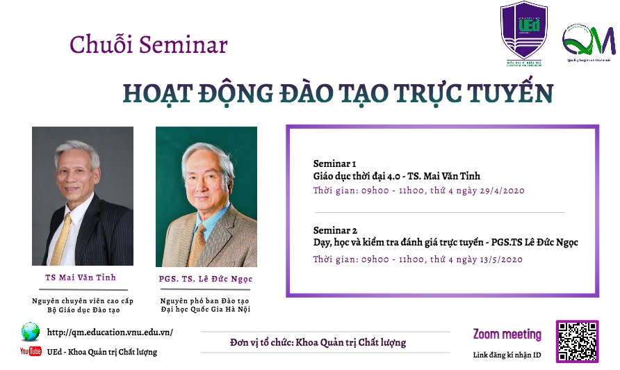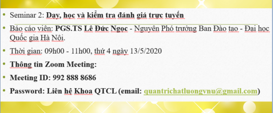 Đặc biệt, tiếp nối buổi seminar chuyên môn, Seminar về “Dạy, học và kiểm tra đánh giá trực tuyến” sẽ được diễn giả PGS.TS Lê Đức Ngọc - Nguyên Phó trưởng Ban Đào tạo - Đại học Quốc gia Hà Nội chia sẻ vào sáng thứ 4 ngày 13/5/2020. Quý thầy cô quan tâm có thể đặt câu hỏi gửi về Email: This email address is being protected from spambots. You need JavaScript enabled to view it.