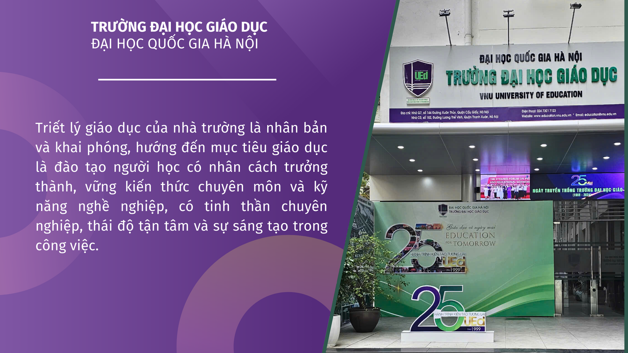 Trong 25 năm hình thành và phát triển, Trường Đại học Giáo dục, Đại học Quốc gia Hà Nội đã không ngừng khẳng định vị thế của mình trong ngành giáo dục, góp phần đào tạo ra những thế hệ thầy cô tài năng, mang đến những giá trị bền vững cho xã hội. Sự kiện kỷ niệm 25 năm truyền thống không chỉ là thời điểm để tri ân những đóng góp của các thế hệ đi trước, mà còn là cơ hội để tất cả các thế hệ cán bộ và người học cùng nhìn về phía trước, hướng tới tương lai với những ước mơ lớn lao. Nhà trường sẽ tiếp tục xây dựng và phát triển nền giáo dục bền vững, tạo dựng những giá trị lâu dài cho xã hội. Chuỗi thời gian các hoạt động kỷ niệm 25 năm truyền thống của Trường Đại học Giáo dục, Đại học Quốc gia Hà Nội như sau: