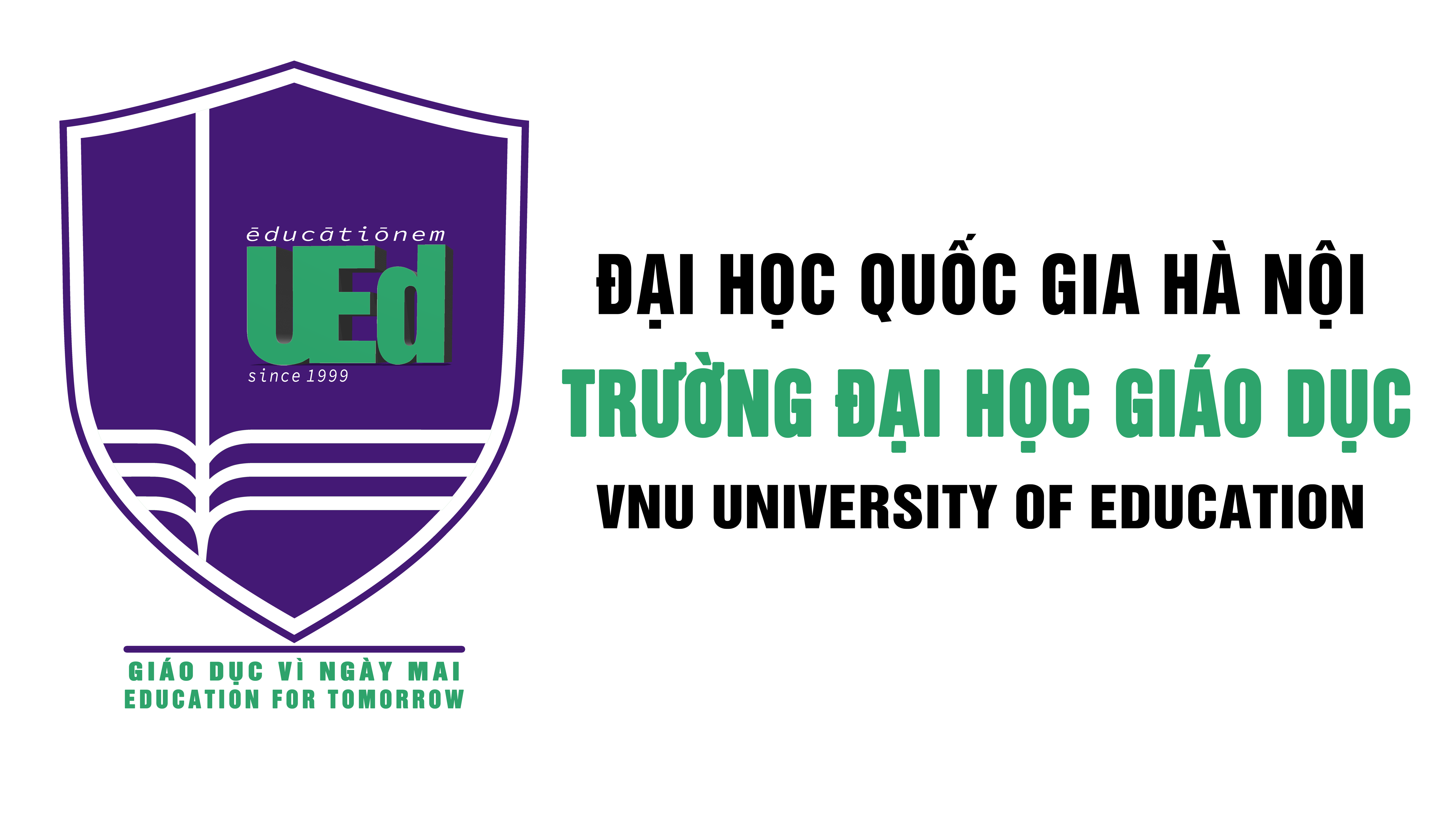 Cụm tên đầy đủ của trường đặt bên phải Logo, với dòng trên cùng màu đen là tên cơ quan chủ quản viết in hoa (ĐẠI HỌC QUỐC GIA HÀ NỘI), phía dưới là tên trường bằng tiếng Việt viết in hoa (TRƯỜNG ĐẠI HỌC GIÁO DỤC) và tiếng Anh viết in hoa (VNU UNIVERSITY OF EDUCATION)