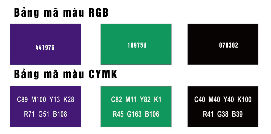 - Mầu sắc đặc trưng của Logo phải được ưu tiên áp dụng và duy trì tính thống nhất của thương hiệu. Khi in ấn, sản xuất các sản phẩm mang Logo trên các vật liệu khác nhau như: vải, gỗ, đá, kính, kim loại… cần đối chiếu với bảng mã mầu được liệt kê bên dưới hoặc tham khảo thêm ý kiến của bộ phận truyền thông trước khi sử dụng.
